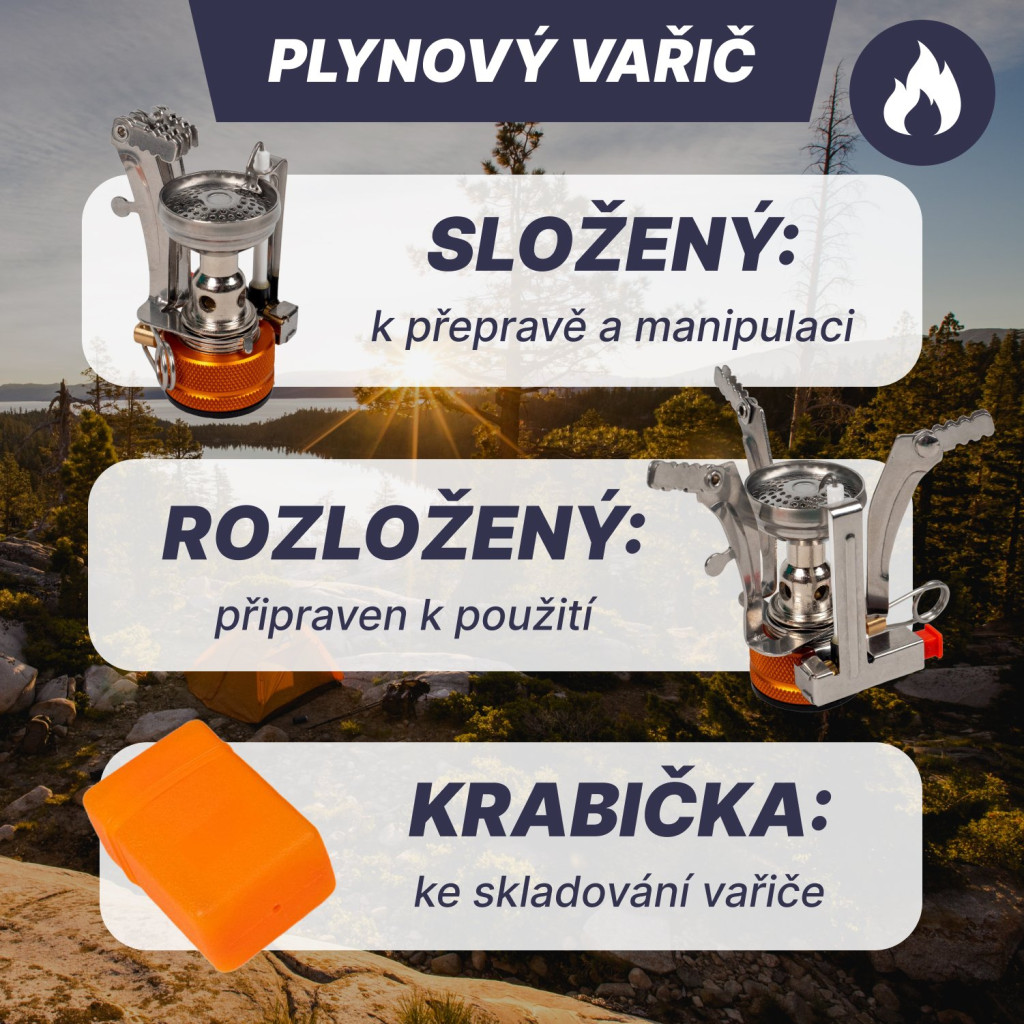 A készlet tartalmaz egy csavaros kupakos gáztűzhelyet is. Így nem kell pluszban keresgélned, és gyakorlatilag bármikor elkészítheted ételeidet.