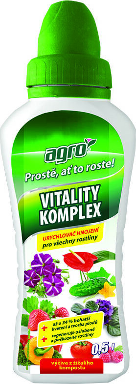 Trágya Agro Vitality Complex 0,5 liter alkalmas legyengült, nem növekvő és elhanyagolt növényekre, minden típusú szobanövényre, apró gyümölcsökre, zöldségekre, dísznövényekre, ill. más növényekre a kertben. Felgyorsítja a növények regenerálódását betegségek és kártevők által okozott károk után. Kiválóan alkalmas a növények megjelenésének újraélesztésére, amely visszaállítja eredeti megjelenését és új hajtásokat indít el. A Vitality Complex támogatja a növények növekedését, fokozza a virágzást a gyümölcs zöldségekben és gyümölcsökben, pozitívan befolyásolja a gyümölcsök méretét és ízét, sőt növeli a C-vitamin tartalmát.