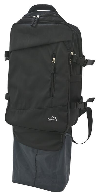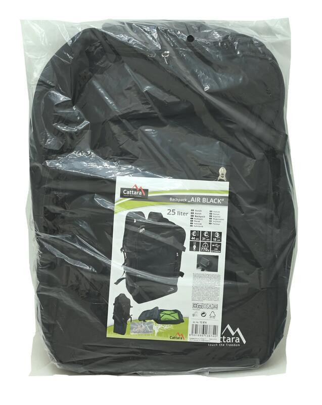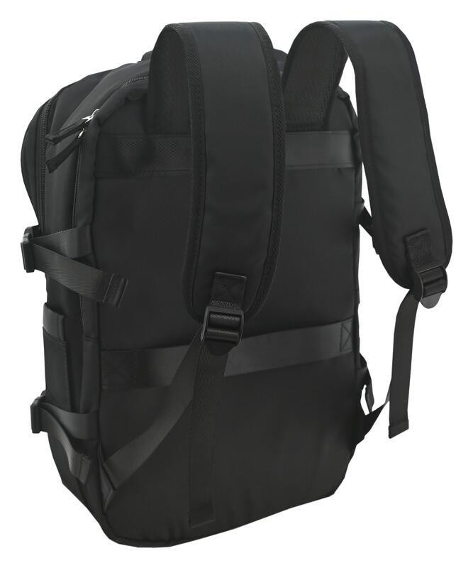 A hátizsák 100 % poliészterből készült, és minőségi párnázással rendelkezik a kényelmes viselet érdekében hosszabb utak során is. A fő tárolórendszert két különálló rekesz alkotja kétirányú cipzáras záródással. A nagyobb rekesz rögzítő rendszerrel és belső zsebbel rendelkezik az apró tárgyak számára. Az elülső részen két kisebb zseb található, az alsó rész pedig rejtett hosszabbítással biztosítja a térfogat növelését.