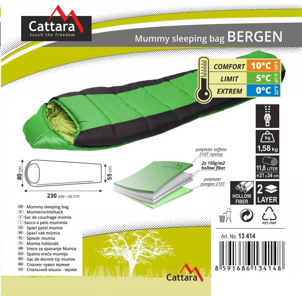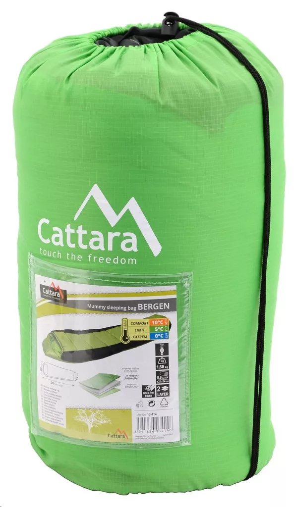 A Cattara Bergen 0°C egy múmia típusú hálózsák, amely sokoldalúan használható és magas kényelmet biztosít 230 × 80 / 55 cm méretének köszönhetően. Kompakt, 21 × 34 cm-es csomagméretével rendkívül könnyen hordozható. Ideális sátorozáshoz, túrázáshoz, kempingezéshez vagy lakókocsiban, nyaralóban való használatra. Tökéletesen követi a test vonalát, kiváló hőszigetelést nyújt, és összehúzható kapucnival van felszerelve, amely melegen tartja a fejet.