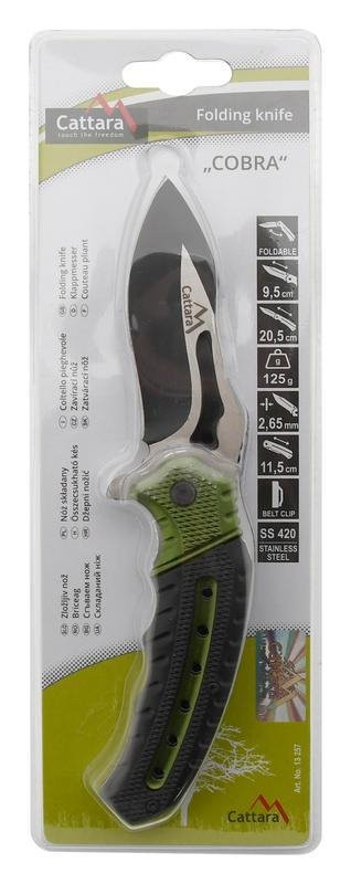 A Cattara COBRA össezcsukható 20,5 cm zsebkés nélkülözhetetlen része a kempingezés, horgászat és a legtöbb kültéri tevékenység felszerelésének. A kés pengéje 420J2 acélból készül, 9,6 cm hosszú és 2,65 mm vastag. Ez a króm, nikkel, mangán, szilícium, foszfor, szén, kén és vas ötvözete kiváló HRC52-54 keménységet ér el és különösen alkalamas kedvezőtlen környezetbe, ahol kitűnik a rozsdásodás és külső hatásoknak való ellenállásával.