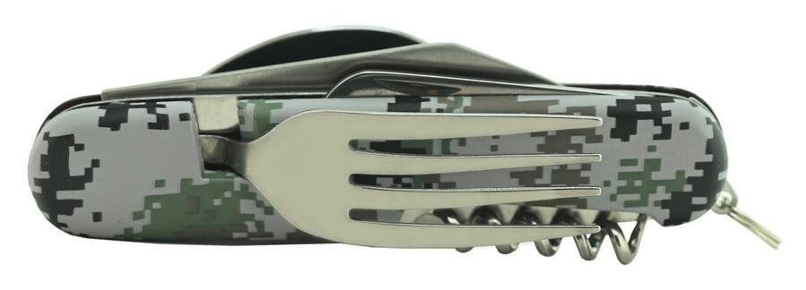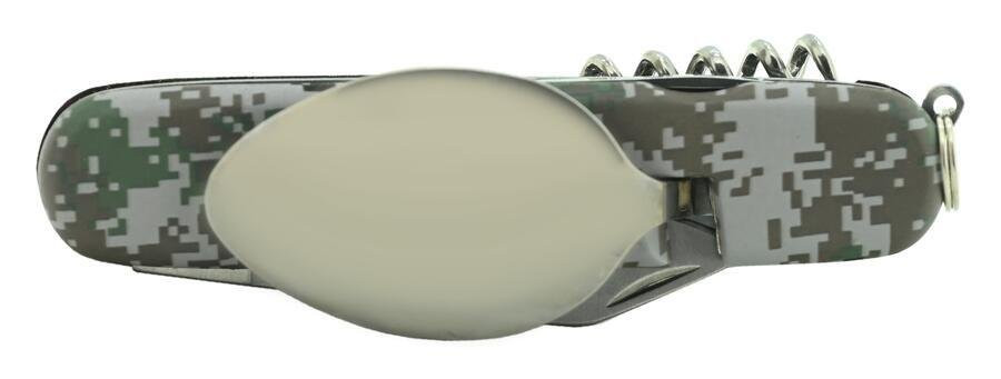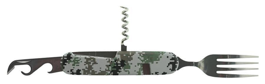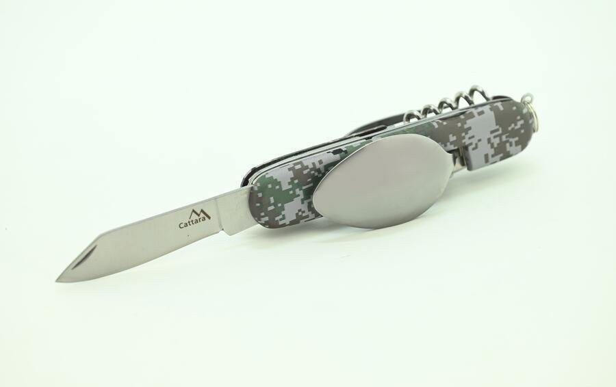 Kompakt összecsukható kés Használhatja a Cattara DIGI CAMPER-t kempingezéskor, túrázáskor, természeti kirándulásokon és otthon a kertben. Az első rész egy villából, konzervnyitóból, sörnyitóból és dugóhúzóból áll. A második rész egy kanalat, egy ütőt és egy 7,5 cm hosszú késpengét tartalmaz. Mindezek a szerszámokrozsdamentes acélból készülnek, így korrózióállóak.A kést a gyűrű segítségével kulcstartóhoz vagy hátizsákhoz rögzítheti.