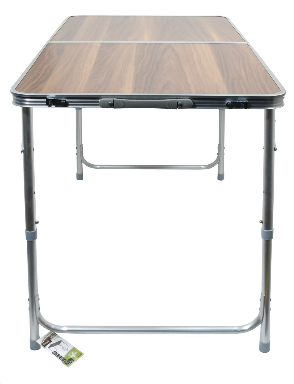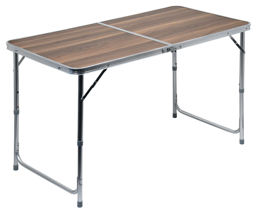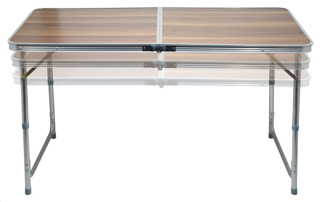 Könnyen tisztítható és tárolható asztal Double minőségi alumíniumból és umakartból. Umakart felület sötét fa mintával. Teleszkópos magasság beállítás 56 / 62 / 72 cm.