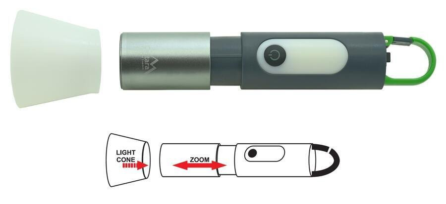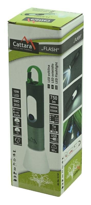 A Cattara FLASH márkájú nagy teljesítményű LED lámpa praktikus és sokoldalú segítőtárs bármilyen helyzetre. A fő 10 W-os LED fényforrás reflektorral van ellátva, amely az üveglencsével együtt akár 750 lm optikai fényerőt biztosít. A praktikus ZOOM funkciónak köszönhetően fokozatmentesen állítható a fényerő és a világítási távolság, csak húzza előre a lámpa fejét. A csomag tartalmaz egy felszerelhető fénykúpot is, amely kellemesen szórja a fényt – hasonlóan egy hagyományos izzóhoz. Ideális sátorozáshoz vagy esti pihenéshez.