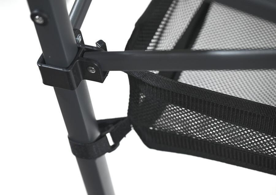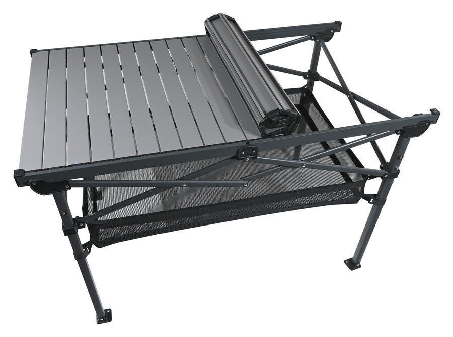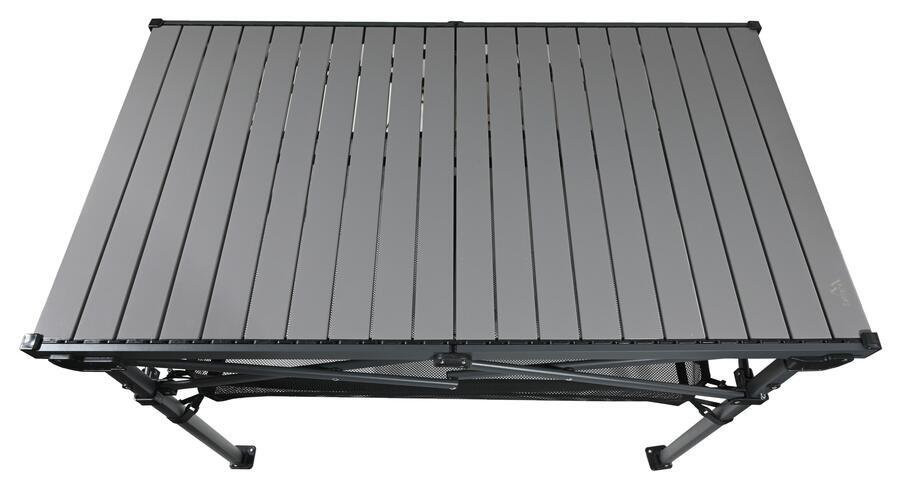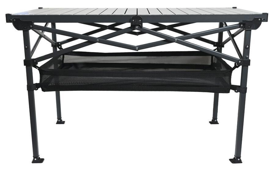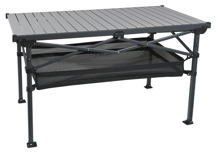 A masszív keret és a talajhoz rögzíthető lábak biztosítják a stabilitást még egyenetlen felületen is. A lamellás asztallap szerkezete egyszerű összecsukást és szétnyitást tesz lehetővé. A praktikus hálós tárolórekesz révén mindig kéznél lehetnek az apróságok. Összecsukva az asztal könnyedén elfér az autóban vagy lakókocsiban.