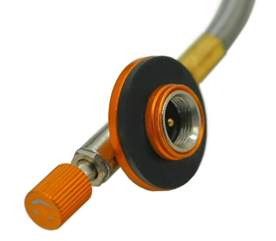 Az égő egy 60 cm-es tömlővel van felszerelve, amely acéllal van fonva. A végén egyszabályozó található, 30 x 2 mm-es tömítéssel. Segítségével beállíthatja az ideális gázáramlást. Ez lehetővé teszi a láng méretének beállítását. Az EN 417 propán-bután patront a 7/16"-os menetre kell felcsavarni. Ugyanolyan menetméretű önzáró szeleppel kell rendelkeznie.