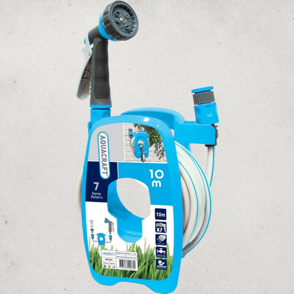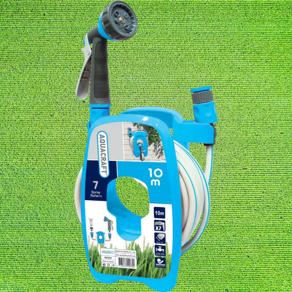 Fali tömlődob, Aquacraft 990490, kék, tömlővel, 3/8", 10 m, 7 funkciós szórópisztollyal, csatlakozókkal, műanyag
