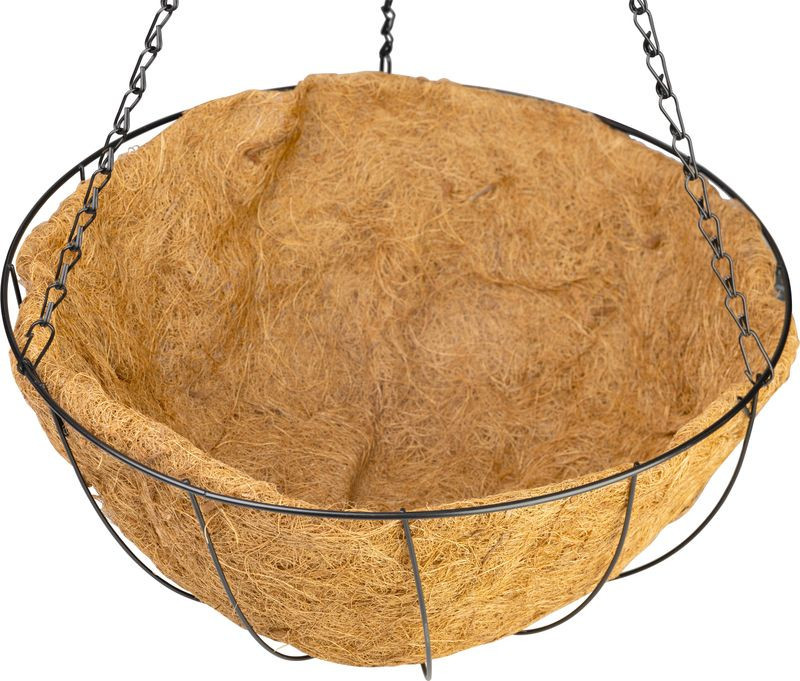 A fém részeket száraz vagy enyhén nedves kendővel töröld át, majd alaposan szárítsd meg. A kókuszrost betétet ne áztasd; ha elhasználódik, cseréld ki friss betétre. Hideg, fagyos időben ajánlott beltéri tárolás, hogy a kosár hosszabb ideig megőrizze esztétikus állapotát.