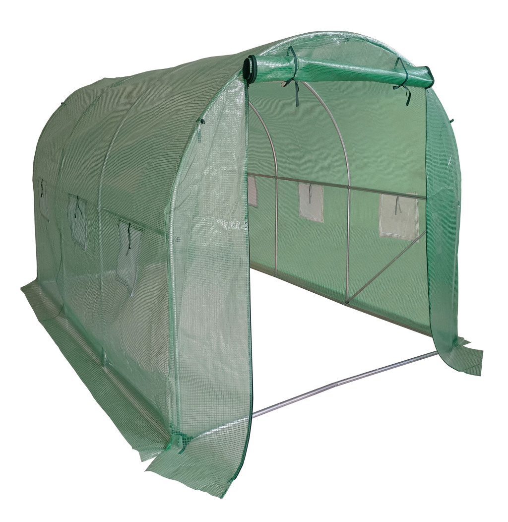 Kerti fóliasátor stabil horganyzott acélszerkezettel, minőségi erősített polietilén (PE) fóliával, elülső fal 120 cm széles bejárati nyílással, 6 szellőzőablakkal, 4 rögzítő kötéllel és csapokkal, cipzáras felgöngyölíthető bejárattal.