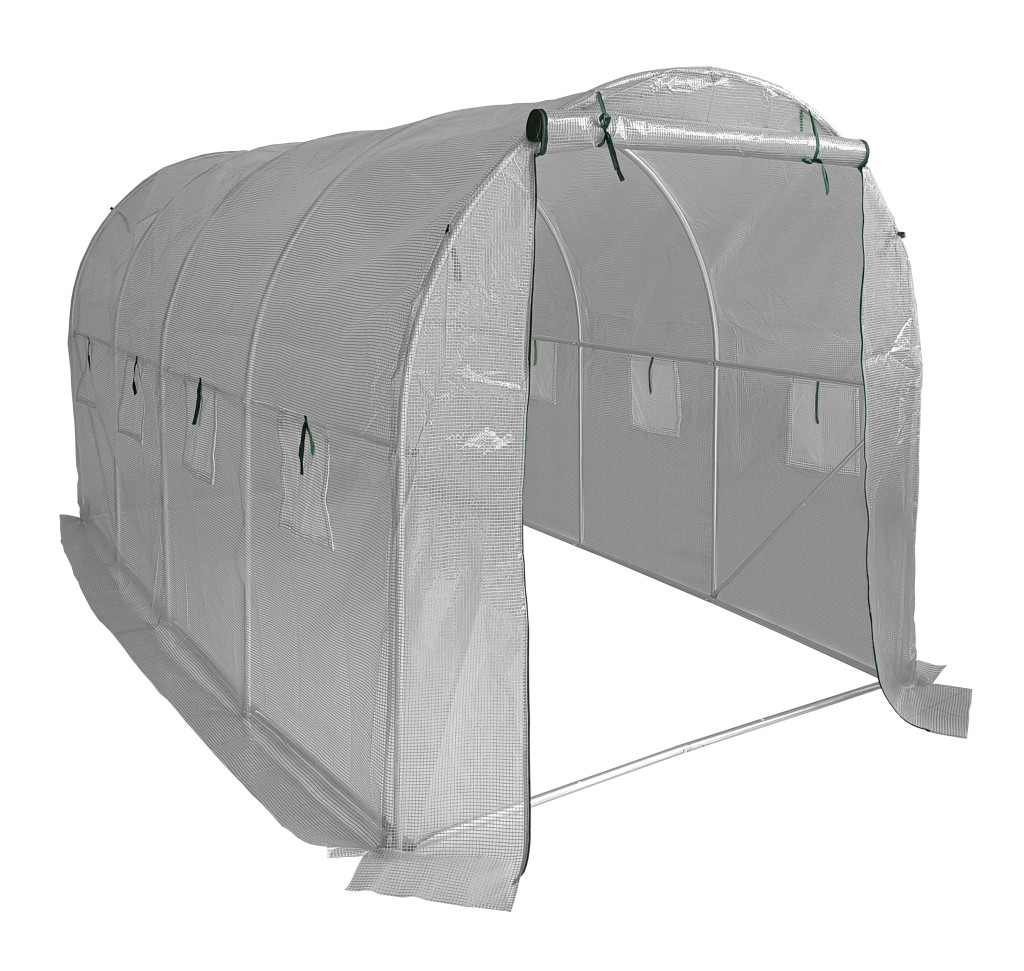 Kerti fóliasátor stabil horganyzott acélszerkezettel, minőségi erősített polietilén (PE) fóliával, elülső fal 120 cm széles bejárati nyílással, 8 szellőzőablakkal, 4 rögzítő kötéllel és csapokkal, cipzáras felgöngyölíthető bejárattal.