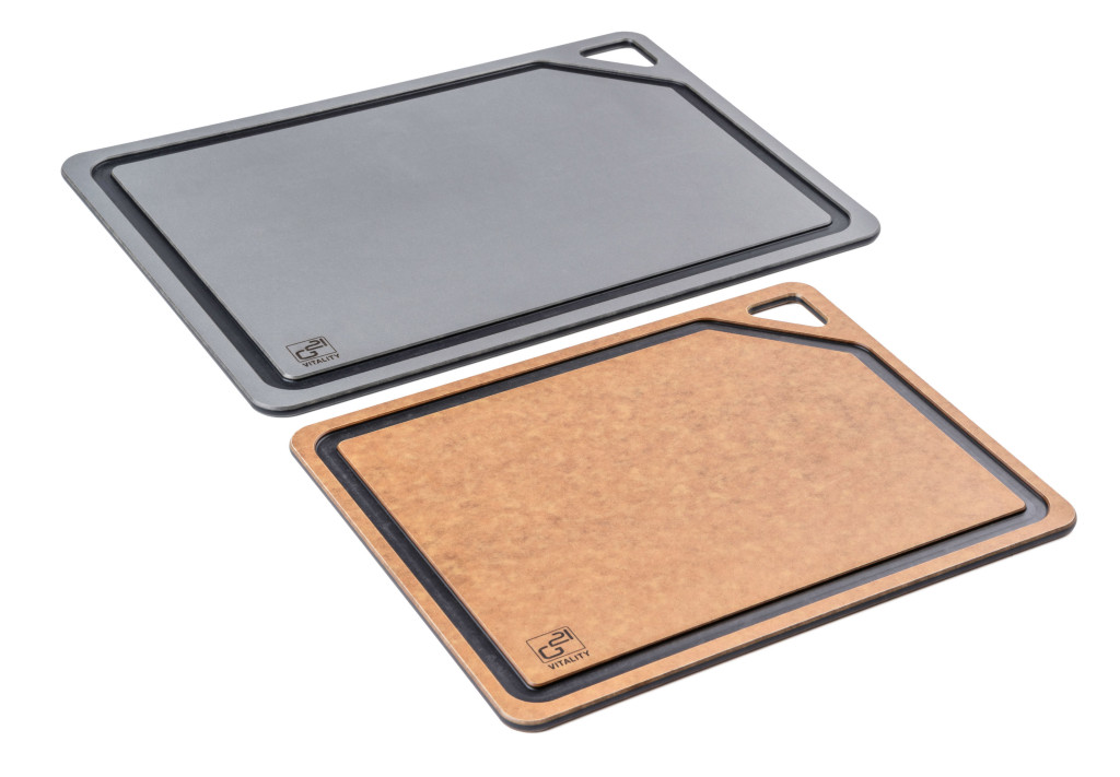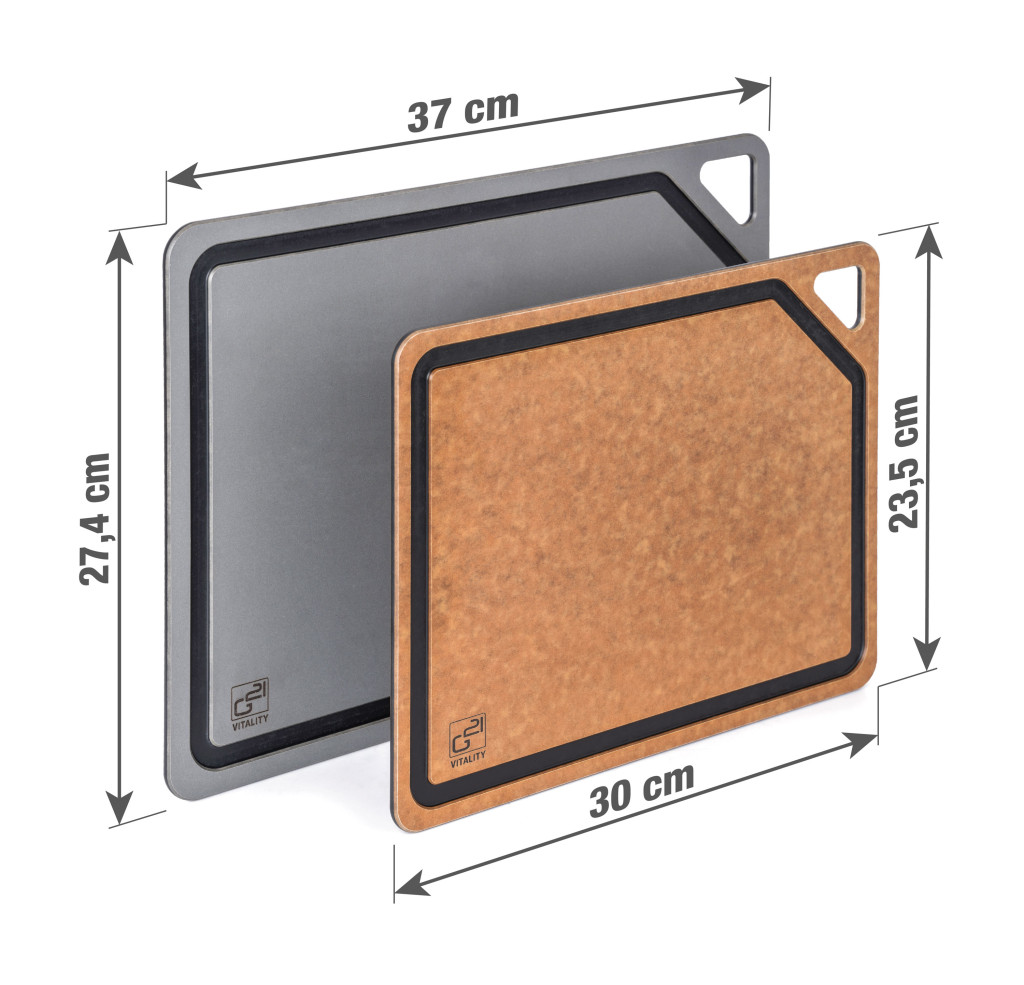 Az biológiailag lebomló cellulózból készült univerzális EcoCut deszkák tartósságot, késekhez való kíméletet és modern megjelenést kínálnak. A hőállóságnak köszönhetően akár edényalátétként is használhatók forró edényekhez. A csúszásmentes felület biztosítja, hogy a deszka munka közben a helyén maradjon, míg a perem menti vájat felfogja a húslevet vagy más folyadékokat – így a konyhapult mindig tiszta marad. A csomag 2 méretű deszkát tartalmaz (30 × 23,5 cm és 37 × 27,4 cm), amelyek ideálisak hús, zöldség, gyümölcs és fűszernövény előkészítéséhez.
