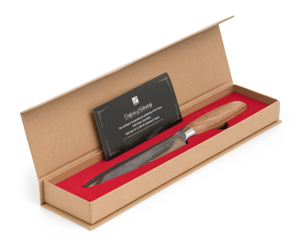 A damaszkuszi acél pengével rendelkező G21 konyhakéseket porfém technológiával készítik, ahol az alapfémet (ebben az esetben a VG-10 acélt) rétegek borítják, amelyeket fokozatosan összeolvasztanak. A rétegek eltérő összetétele különböző színárnyalatokat eredményez.