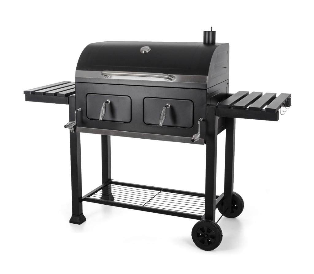 A grill alján található kerekek lehetővé teszik a grill könnyű kezelését és a kényelmes áthelyezését. A grill alsó felében méretes polc és a két oldalán még két acél polc található, amelyek lecsukhatóak. Szükség esetén odahelyezheti a grillező eszközöket vagy elkészített alapanyagokat.