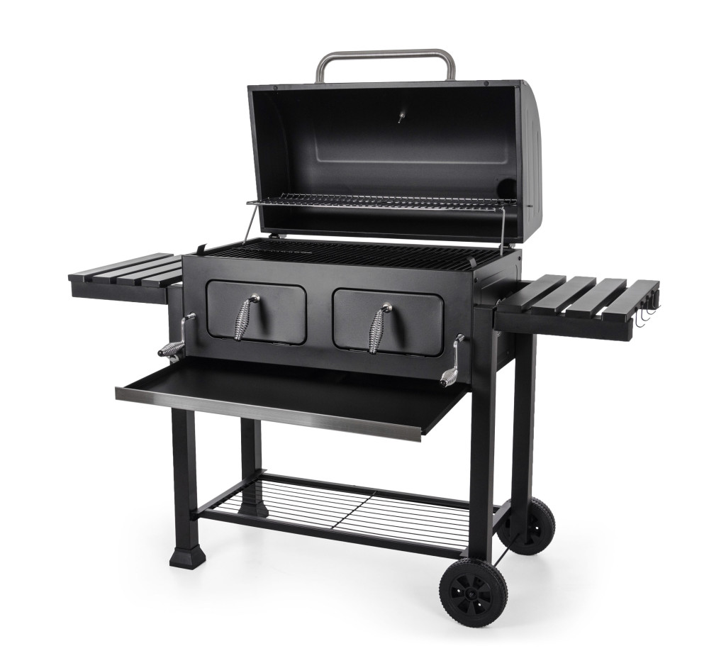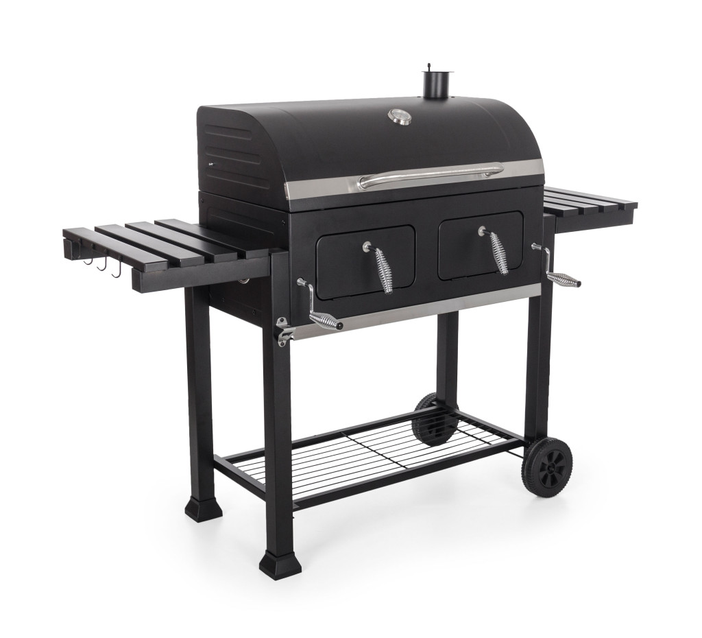 A grill alján található kerekek lehetővé teszik a grill könnyű kezelését és a kényelmes áthelyezését. A grill alsó felében méretes polc és a két oldalán még két acél polc található, amelyek lecsukhatóak. Szükség esetén odahelyezheti a grillező eszközöket vagy elkészített alapanyagokat.