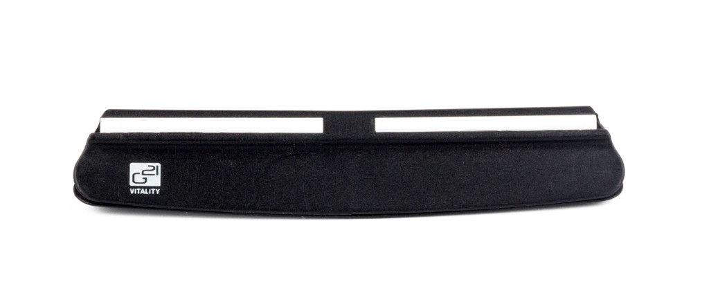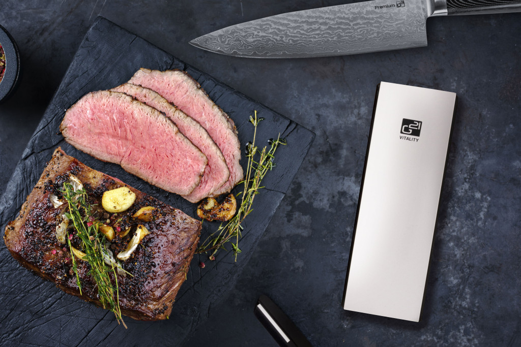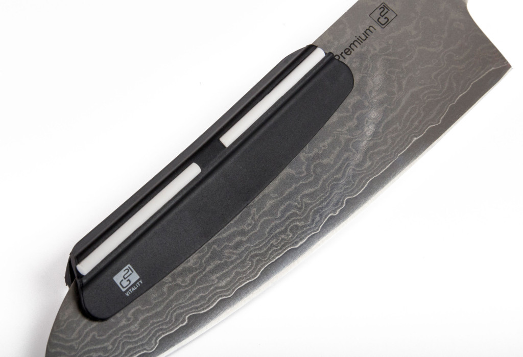 A korundból készült köszörűkövet szilikonblokkban, méretre vágva tároljuk. A csomagban egy praktikus beállított köszörülési szöggel (15°) rendelkező útmutatót is talál.