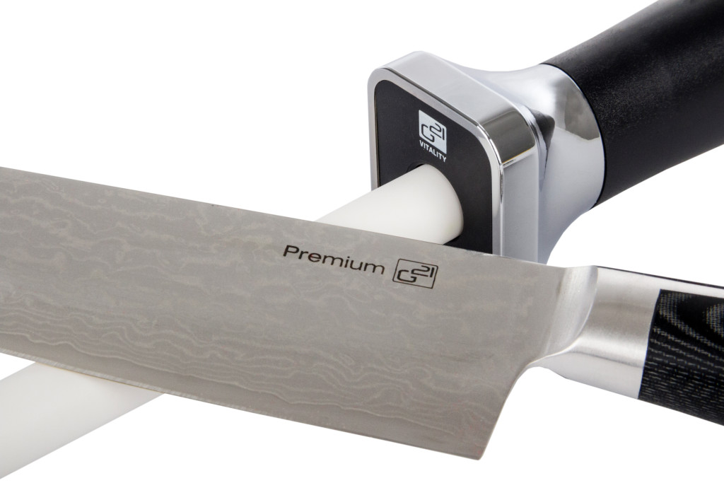 2. Helyezze a kést úgy, hogy a penge megfelelő szögben feküdjön a kés élezőn (klasszikus kések 25–30 °, damaszt kések 20–25 °).