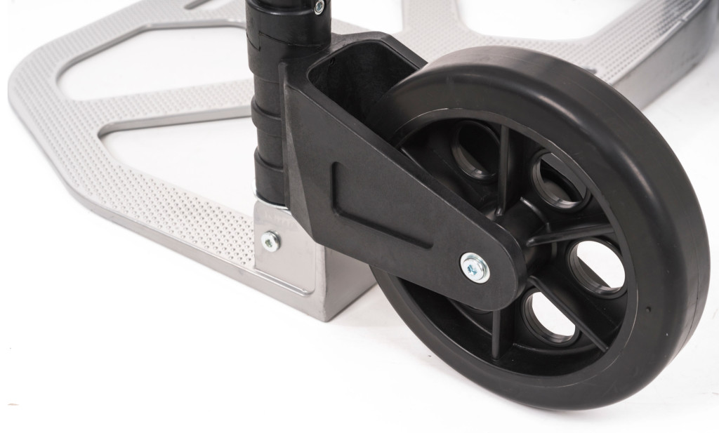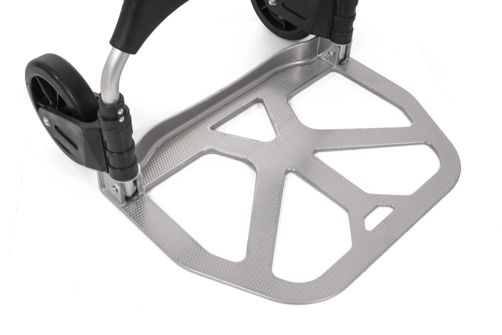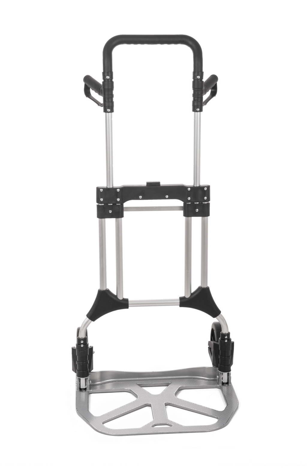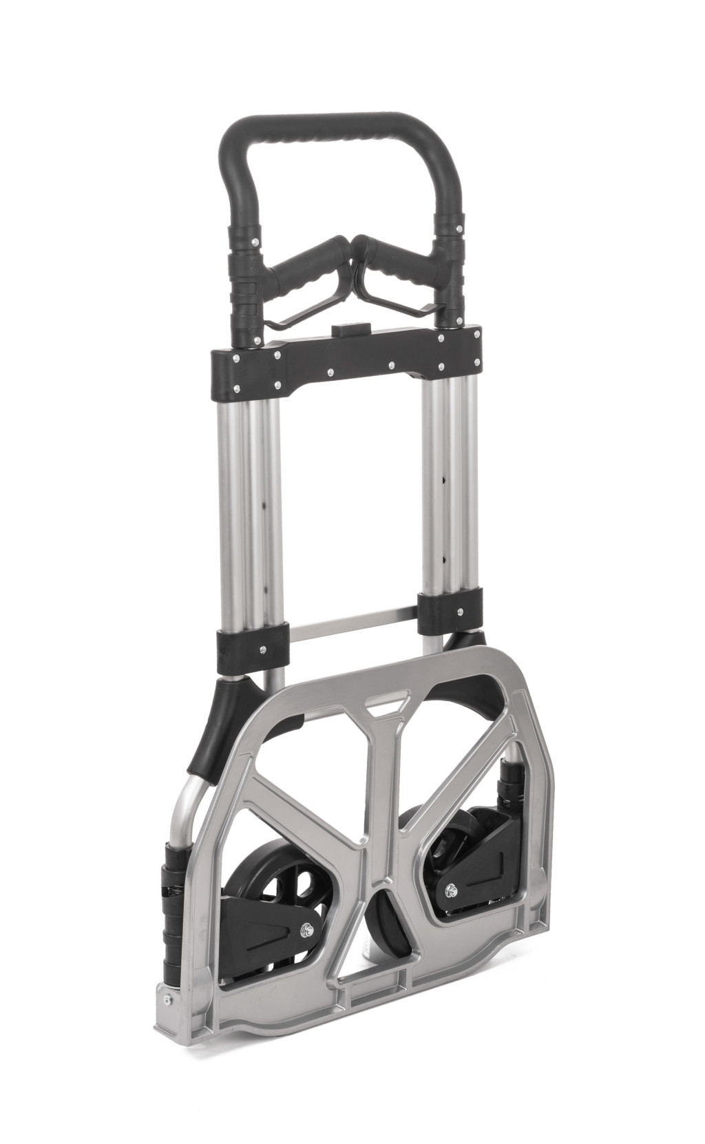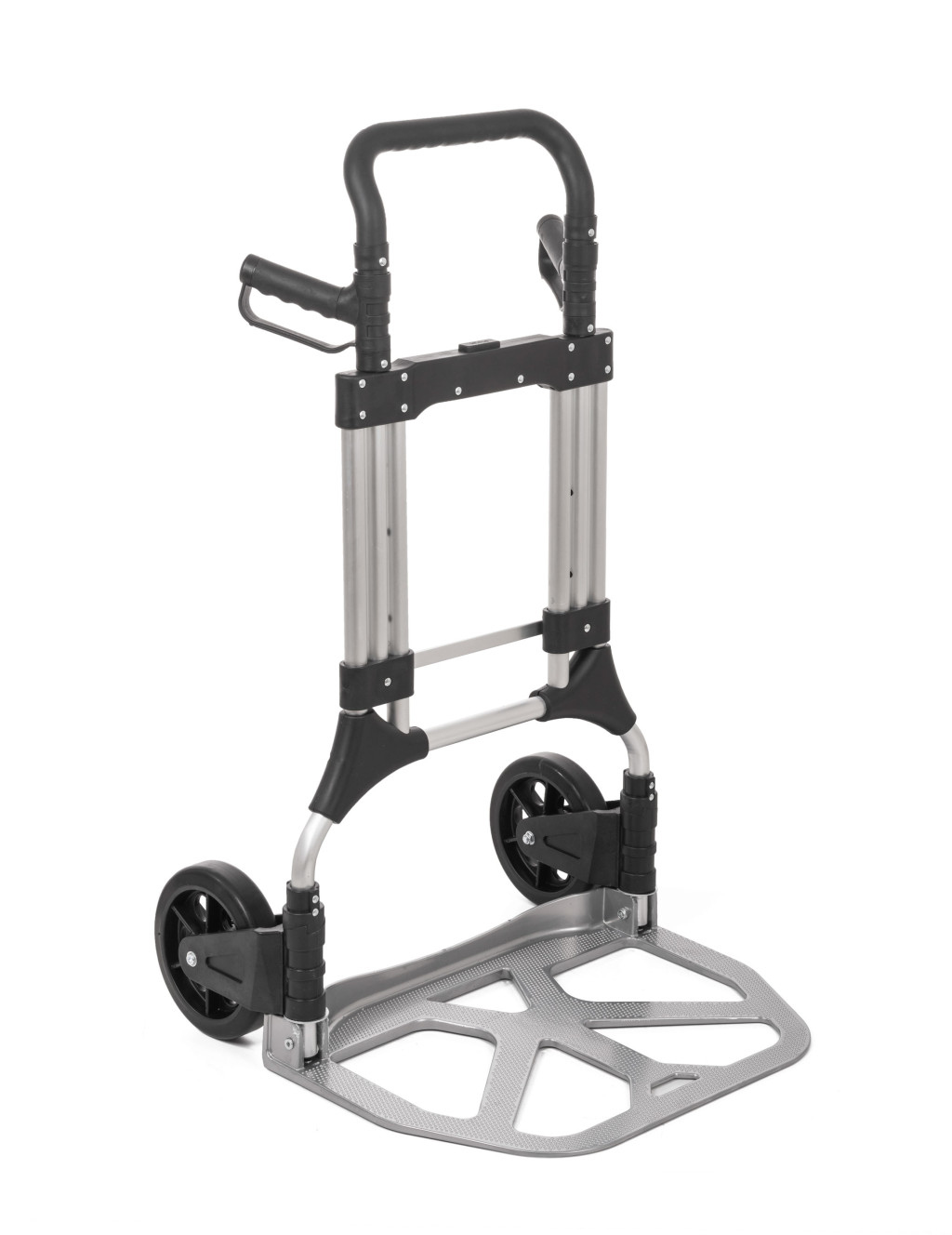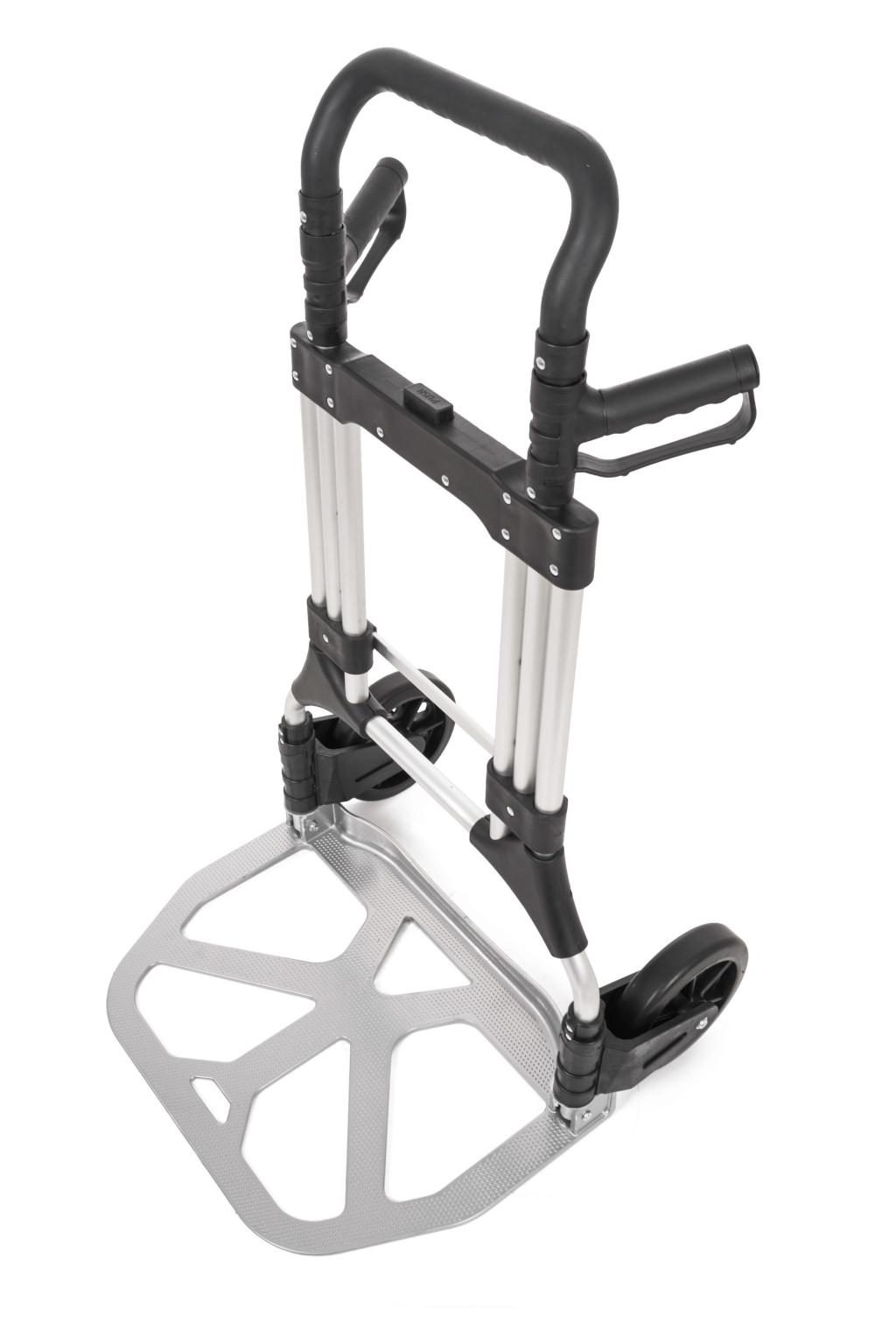 A teljesen alumíniumból készült váz könnyű, mégis rendkívül tartós. Könnyedén elbír akár 200 kg terhet is, még egyenetlen felületeken is. A teleszkópos fogantyú a megfelelő magassághoz igazítható, így kényelmes munkát és szállítást biztosít. A 20 cm átmérőjű kerekek zökkenőmentes mozgást és jó ütéselnyelést biztosítanak. A tágas rakodófelület 42,5 × 59 cm bőséges helyet nyújt a nagyobb tárgyak számára is. Összecsukva a kézikocsi mérete 59 × 107,5 × 9 cm, így könnyen elfér egy autó csomagtartójában vagy a raktárban. Teljes tömege 11 kg.