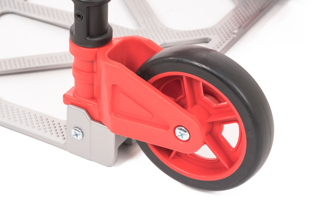 Teherbírás 70 kg, teljesen alumínium váz, lapát 28 × 38,5 cm, 12,5 cm-es kerekek, összecsukható, 3 kg.
