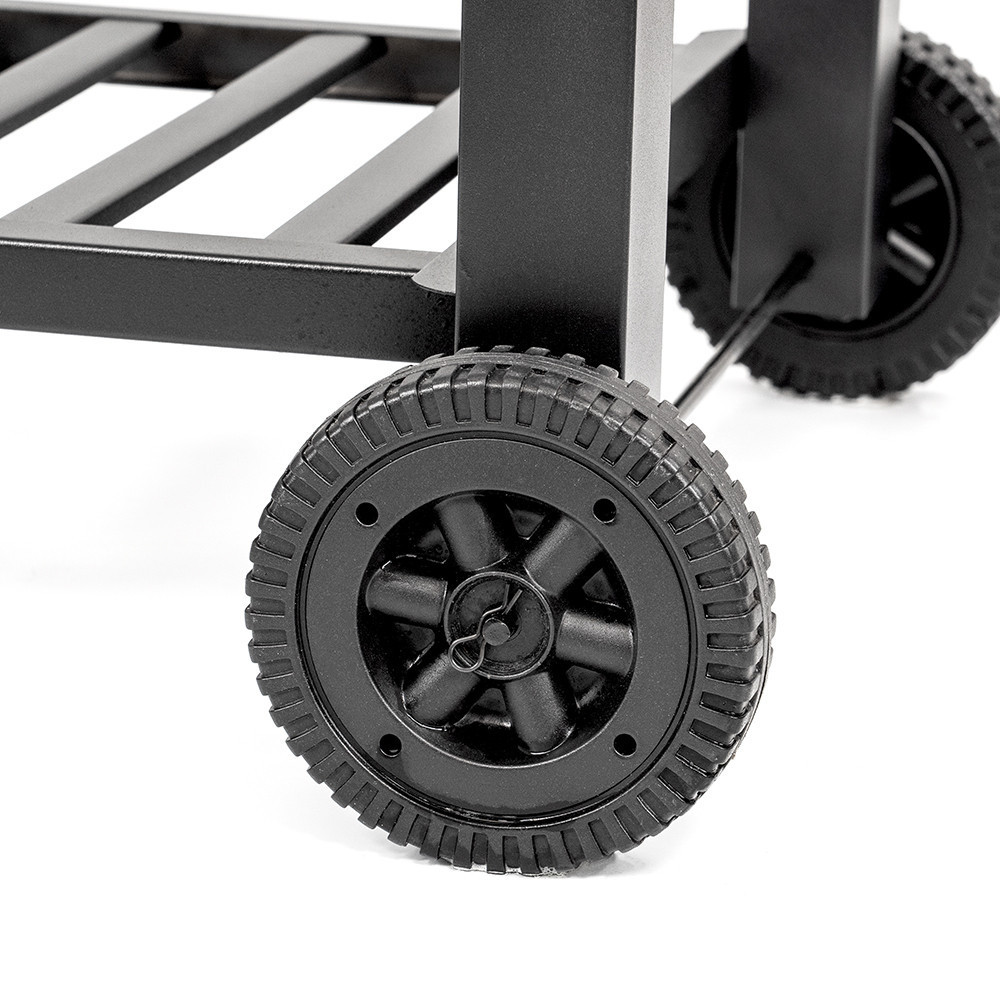 A grillsütő kocsis kivitelű, amely megkönnyíti az elhelyezést és az áthelyezést a kertben vagy a teraszon. Az egyik oldalon kialakított polc előkészítéshez vagy grilleszközök elhelyezéséhez használható. Az alsó tárolópolc további helyet biztosít faszén vagy kiegészítők számára, míg a kerekek segítségével a grillsütő könnyen mozgatható.