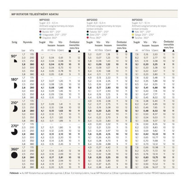 A Hunter MP Rotator fúvókák változó kilépési szögű, forgó vízsugaras öntözőfejek. Típustól függően alkalmazható 45-360°közötti szögtartományban és 1,8-10,5 méteres távolságban. Alacsony intenzitású, kis vízfogyasztású fúvókák, melyeknél jelenleg az egyik legegyenletesebb a kijuttatott csapadék eloszlása. Ha kevés a rendelkezésre álló víz, vagy a meglévő rendszer száraz foltokat hagy a kertben, érdemes egy esélyt adni az MP Rotatoroknak.