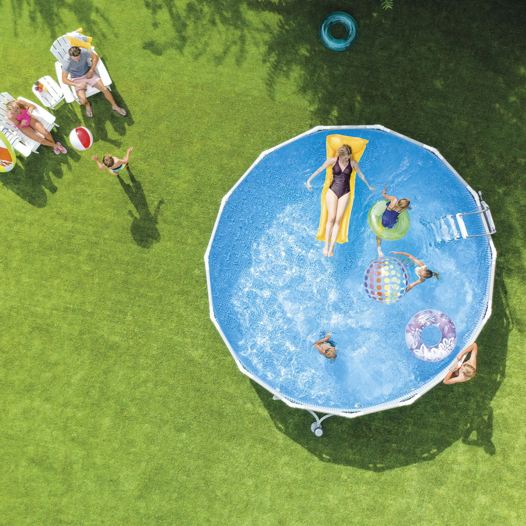 Szinterezett fémvázas medencetest, vastag és extra tartós 3 rétegű szálerősített fóliával, 3,78 m³/h teljesítményű papírszűrős vízforgatóval. Az erős PVC medence testet csőváz tartja, amelyek a testen kialakított füleken keresztül tolva merevítik a szerkezetet.