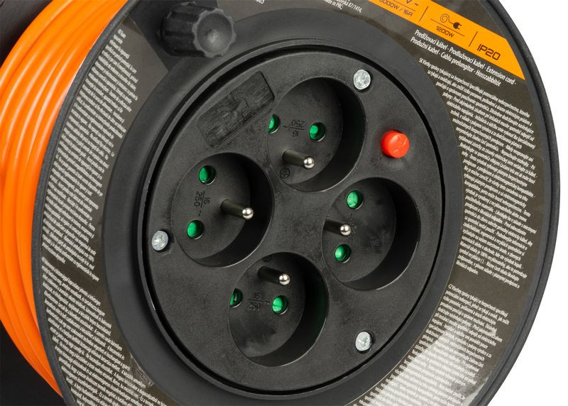 Engedd szabadjára a villamosenergia rugalmasságát a Strend Pro DG-FB04 kábel-dobos hosszabbítóval! 15 m élénk narancssárga, 3×1,5 mm² vezeték juttatja el a 230 V-ot oda is, ahol nincs konnektor. A masszív acél állványra szerelt dob négy földelt aljzattal várja a gépeket, szerszámokat vagy kerti eszközöket. Lecsévélve 3000 W-ig, feltekerve 1200 W-ig terhelhető. Ergonomikus markolata, sima futású hajtókarja és beépített hőkioldója gyors, biztonságos és kényelmes használatot kínál.