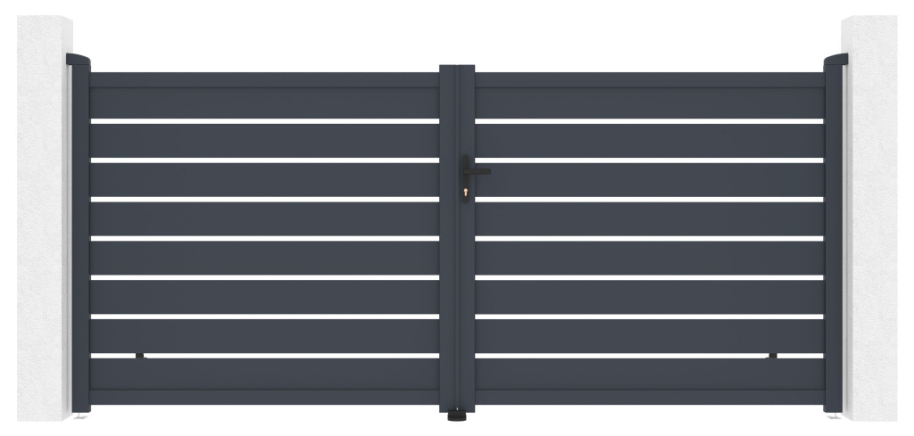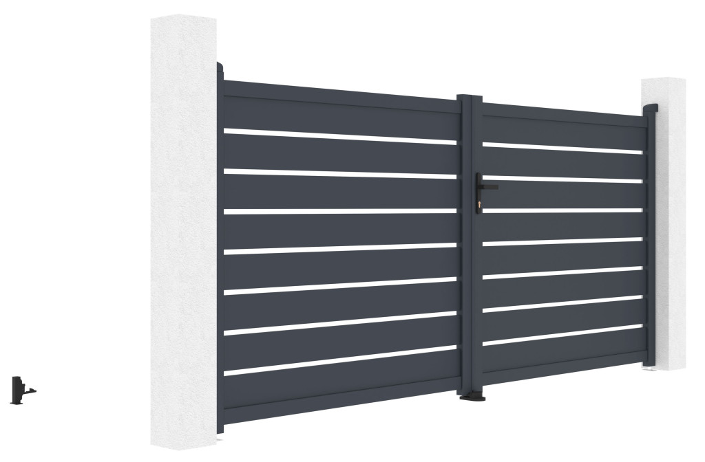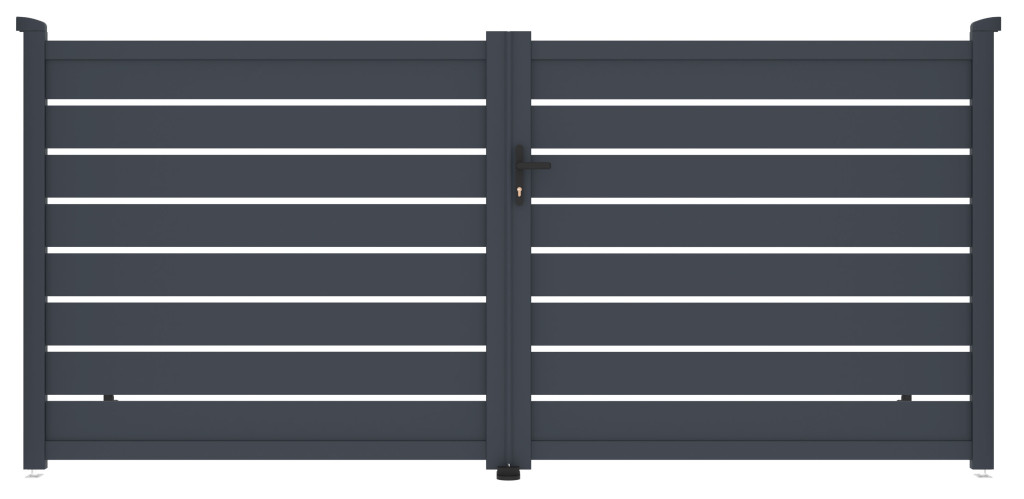 A vízszintesen elhelyezett lécekkel ellátott, tetszetős grafit kialakítású kitöltés a kellő magánéletet ötvözi a modern dizájnnal, így a kapu bármilyen típusú bekerített szerkezethez illeszkedik.