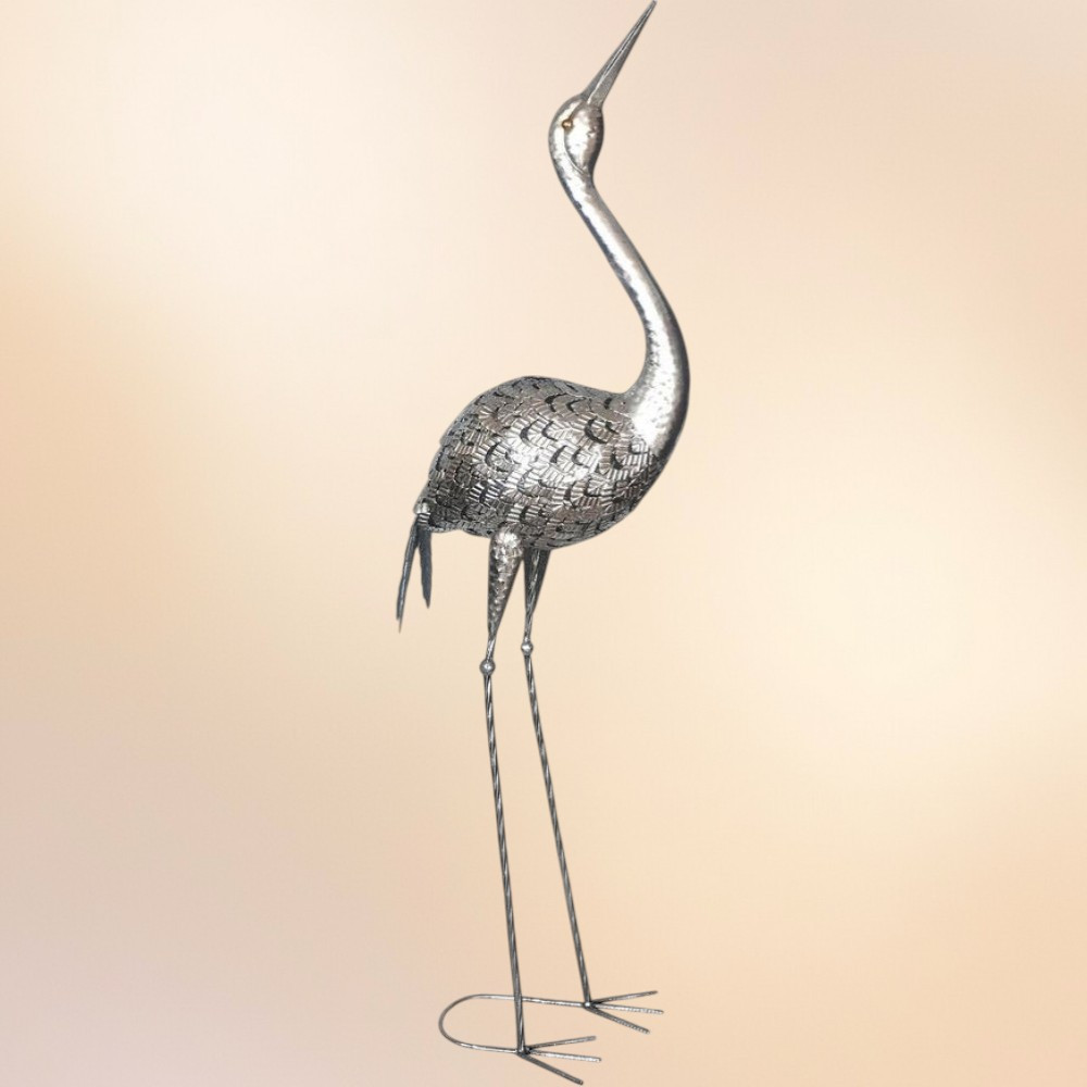 Emeld kerted vagy nappalid hangulatát egy királyi daru látványával! A Dekoráció MagicHome Mecco fémmadár 34 × 23 × 111 cm-es méretével azonnal magára vonzza a tekinteteket. Kézzel formált, texturált tollai finoman verik vissza a napfényt, ezüstös patinájának köszönhetően nappal és lámpafényben is sejtelmesen csillog. Vékony, hosszú lábai stabil talppal végződnek, így gyepen, tóparton vagy teraszon is biztosan áll. Időtlen, természetközeli dísz, amely életet lehel bármely térbe.