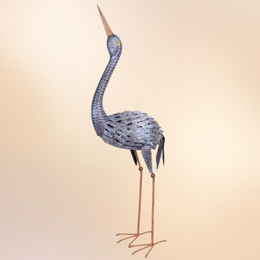 A dekoráció egyszerre elegáns és ellenálló: a festett fémlemez időjárásálló, így nem kell féltenie az esőtől vagy erős napsütéstől. A kézzel kalapált hatás és a rusztikus, kékes-szürkés árnyalatok természetes módon olvadnak a kerti környezetbe, miközben az arany-réz csőr fókuszponttá teszi a művet. A karcsú sziluett optikailag nyújtja a teret, így kisebb udvarokban is látványos díszítő elem lesz.