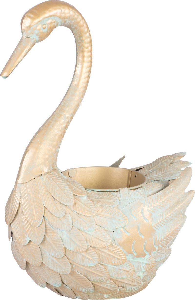 A MagicHome Mecco lúd alakú fém virágcserép aranyszínű, finoman antikolt felületével elegáns fókuszpontot teremt a kertben, teraszon vagy akár a nappaliban. A gondosan kidolgozott tollminták és a magas, kecses nyak játékos harmóniát alkotnak, így egyszerre kelt természetközeli és exkluzív hatást. A 35×18×43 cm-es méretnek köszönhetően kedvenc futó- vagy csüngő növényeidet könnyedén elhelyezheted benne, új életet lehelve a környezetbe.