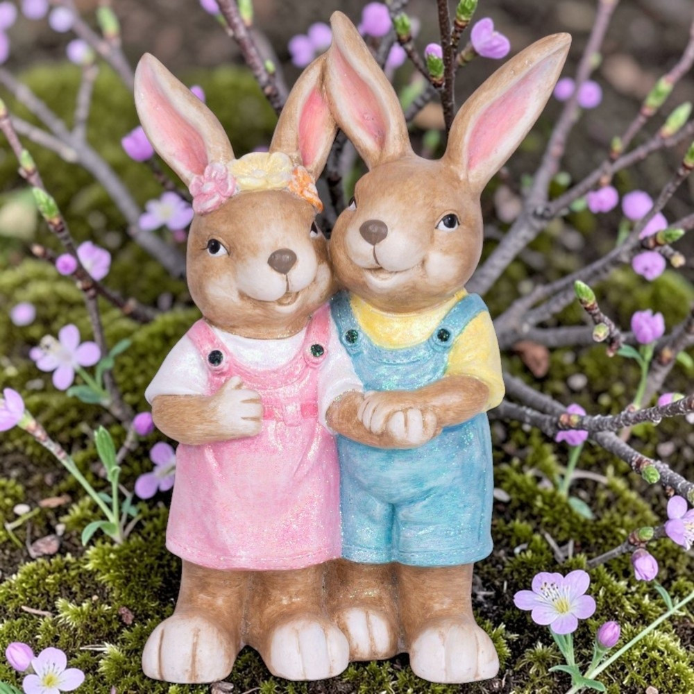 Varázsolj tavaszi hangulatot otthonodba vagy kertedbe ezzel a kedves MagicHome kerámia nyuszipárral! A részletgazdag kidolgozású, mosolygó nőstény és hím nyúl szeretettel simul egymáshoz, így meghitt, barátságos légkört teremt. A 34 cm széles, 19 cm mély és 51 cm magas dísz tekintélyes méretével azonnal magára vonzza a tekintetet, mégis harmonikusan illeszkedik virágágyásba, teraszra vagy nappaliba. A tartós kerámia időtálló, jól bírja a kinti körülményeket és könnyen tisztítható.
