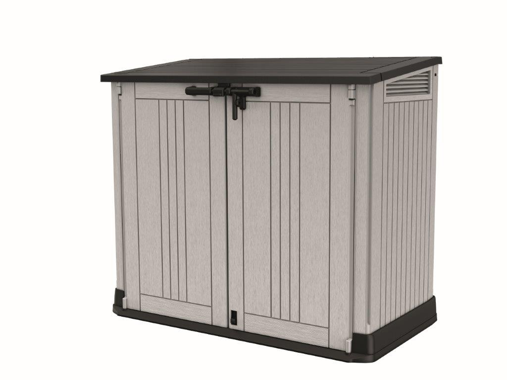 A szürke színű Keter Store-It-Out Midi Prime Upgrade kerti doboz 880 l úrtartalmat nyújt, Így tökéletes tárolóhelyet biztosít a fűnyíró, szemetesek, kerti bútorok, medence szivattyúk,medencetechnika és felszerelés, grillek, kertészeti kellékek és szerszámok számára.A fészerhez a fedél felfele nyításával, illetve a fa dizájnnos ajtók kinyitásával tud bejutni. Azért, hogy a holmijait biztonságban tudja tartani, a doboz zárható. Ráadásul a tulajdonát szárazon és tisztán tartja. A fészer ellenálló szerkezete a rossz idővel is elbír és hosszú életartamot biztosít a terméknek. A tároló dobozba polcokat is szerelhet kisebb tárgyakra. Ezek nem részei a csomagnak.