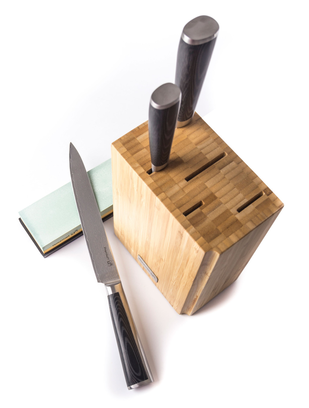 A G21 Gourmet Damascus késtartó bio bambuszfából készült. A fa a legmegfelelőbb anyag a kések tárolásához. A fa a kés becsúsztatásakor nem koptatja annyira a kést, mint más kemény anyag. Az állványban minden késnek megvan a biztonságos helye. A blokkban 5 rekesz van. A rekeszek a G21 Gourmet Damascus késkészlethez vannak méretezve.