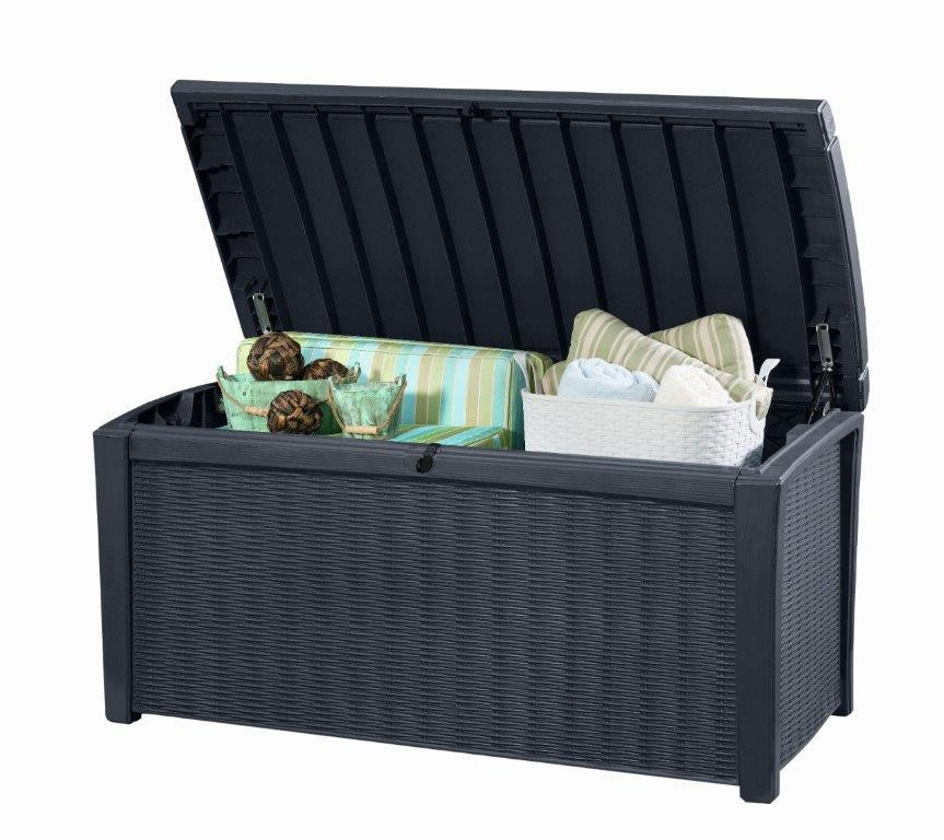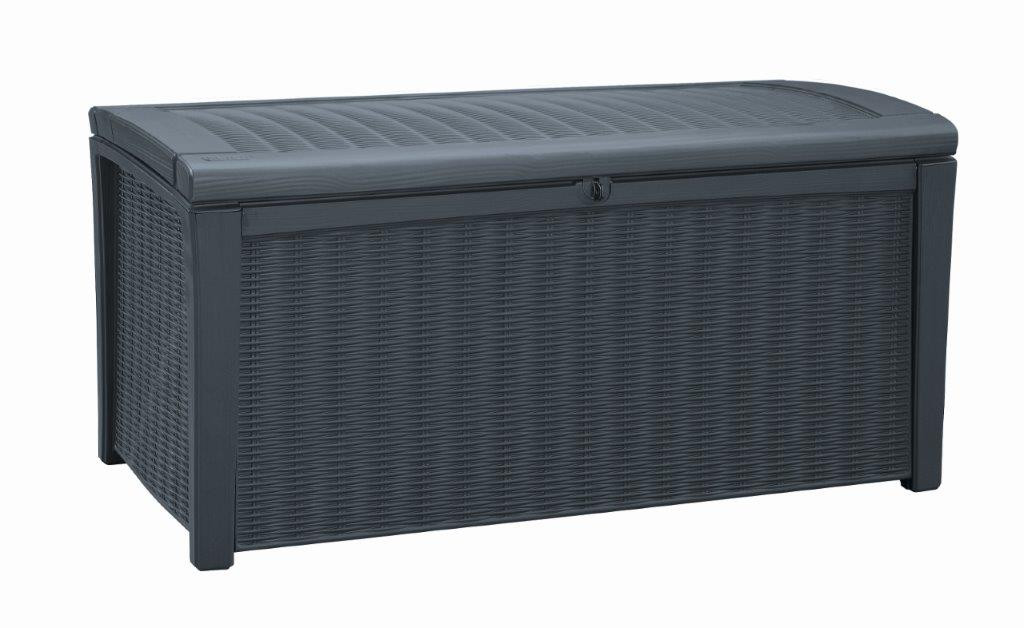 A Keter Borneo kerti doboznak köszönhetően praktikustároló helyet kap, ahol különböző szerszámokat, gyerek játékokat vagy párnákat és takarókat tárolhat. Megvédi a holmijait az esőtől és az időjárás egyéb kedvezőtlen hatásaitól. A doboz 416 l űrtartalmú helyet kínál és a dizájnja, ami a rattant utánozza grafitszürke színben, felkelti a figyelmét minden kert, terasz és erkély tulajdonosának. A fedelét könnyen felnyissa a automatikus mechanizmus segítségével. A zárt doboz asztalként vagyideiglenes ülőhelyként is használhatja. Akár két felnőtt embert is elbír.