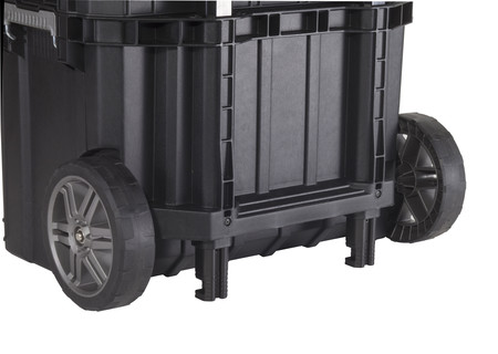 Az ellenálló fém reteszek biztosítják a doboz erős lezárását. A tartalma így nem szóródik ki és biztonságban marad. A teleszkópos markolat és a gumis kerekek megkönnyítik a szállítását és a kezelhetőségét.