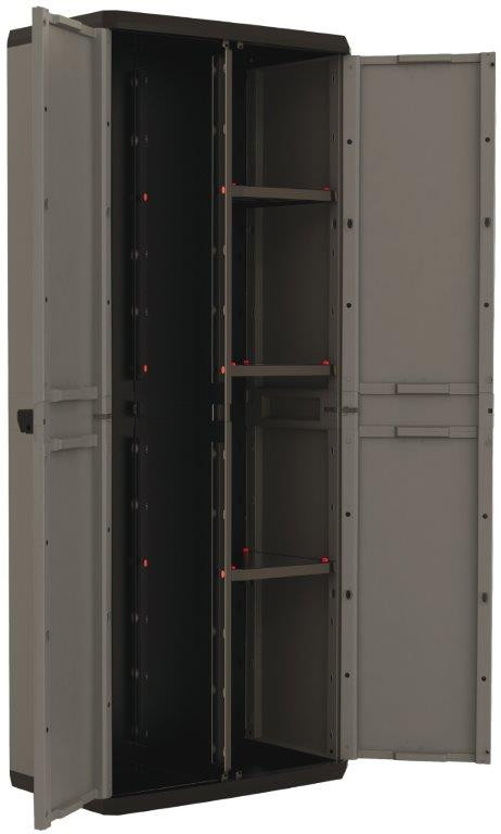 A Keter Piú Utility tökéletes választás, ha kisebb tárgyak és hosszabb eszközök egyidejű tárolására van szükség. Az egyik oldalon 3 állítható polc található, egyenként 10 kg teherbírással, míg a másik oldal nyitott marad – ideális seprűk, mopok, gereblyék vagy porszívócsövek tárolására. Az ellenálló műanyagból készült szekrény alkalmas garázsba, pincébe vagy fedett teraszra is. Lakattal zárható, így biztonságosan tárolhatók benne értékesebb eszközök is.