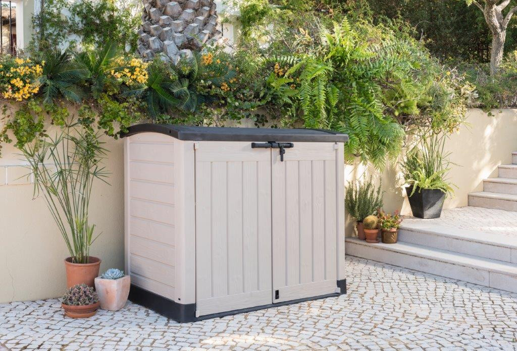 A széles kétszárnyú ajtó fentről egy csavar segítségével zárható, alulról pedig zár segítségével. Azon felhasználók, akik forgalmas negyedben laknak, lakat segítségével is megvédhetik a tároló tartalmát, amivel csökken a szemetes kuka vagy más felszerelés ellopása. A tároló magas minőségű polipropilén gyantából készül modern dizájnnal, amely utánozza a fa struktúráját. Könnyen ellenáll a durva bánásmódnak, vandalizmusnak, extrém időjárásnak és UV sugárzásnak.