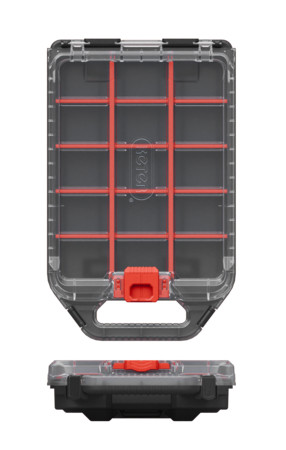15 rekeszből áll, amelyekbe apró tartozékokat, kiegészítőket és egyéb kézműves kellékeket helyezhet el. A rekeszeket beállíthatja a szerszámok mérete és mennyisége szerint. A nagy fogantyú ráadásul megkönnyíti a rendszerező áthelyezését.