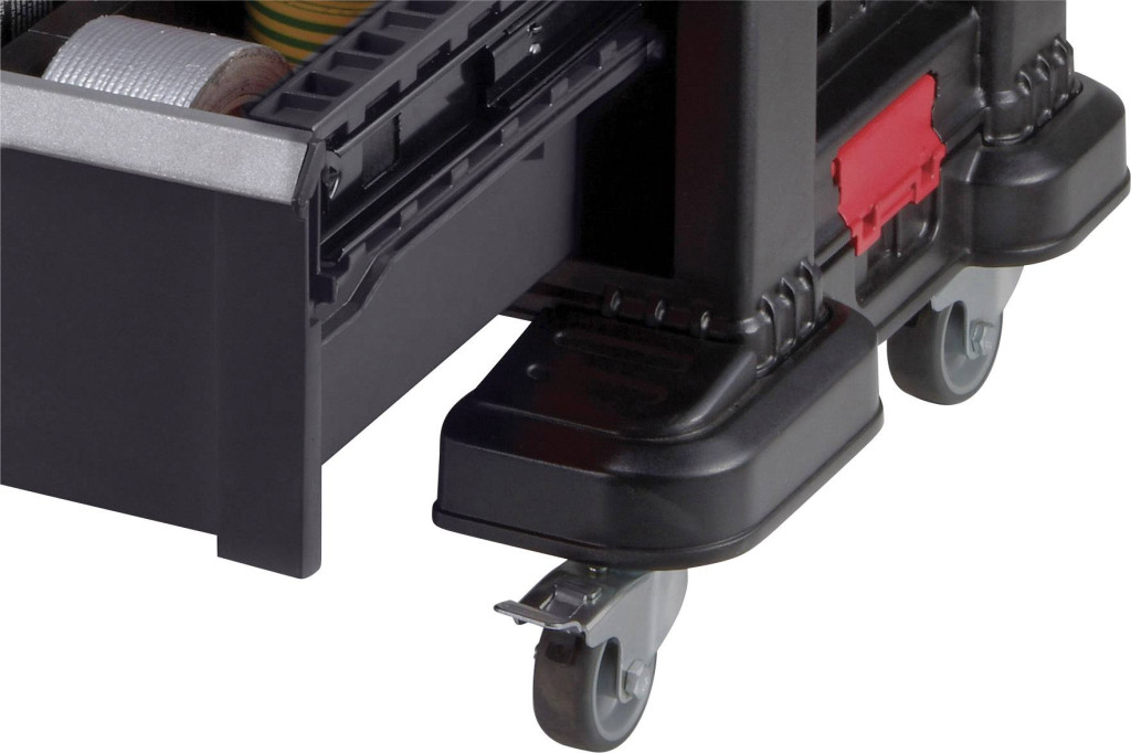 A műhelykocsi két különálló blokkbóláll, amelyek könnyen szétválaszthatók és külön-külön használhatók. Azegymásra rakható kialakítás lehetővé teszi a további fiókos blokkokhozzáadását és eltávolítását szükség szerint. A görgős alap is könnyen eltávolítható. Az első kerekek praktikus fékkel vannak felszerelve.