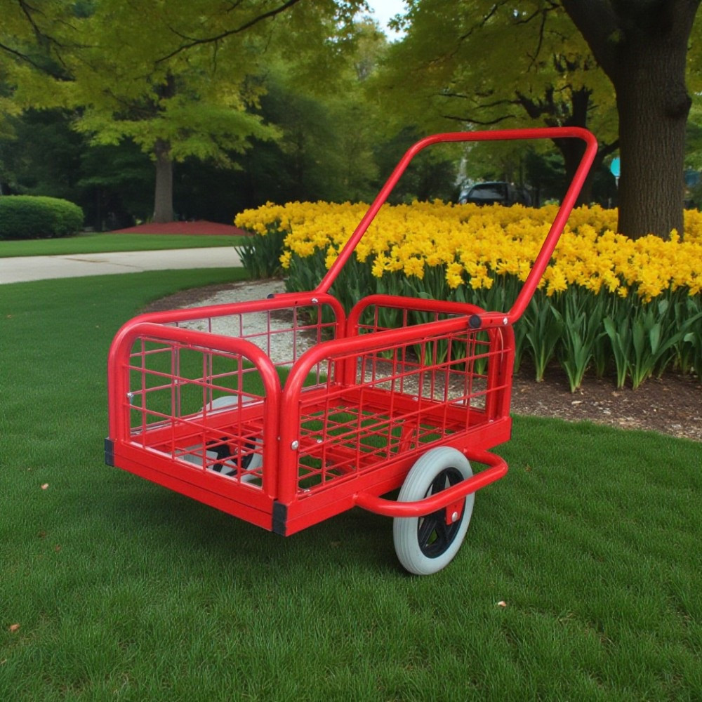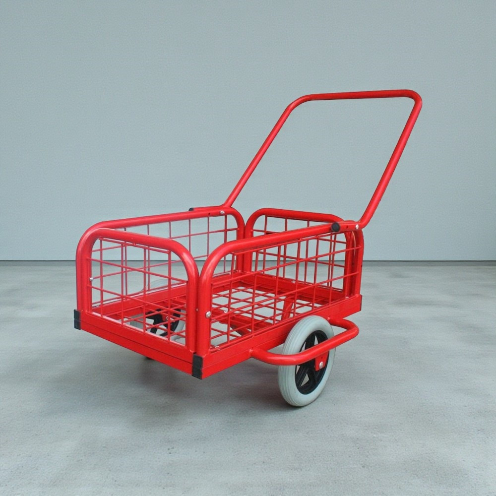 Az ergonomikusan döntött tolókar optimális testtartást biztosít, így hosszabb úton sem fárad el a karod. A nagyméretű, kétkerekű kialakítás egyenetlen talajon is biztos futást ad, a rácsos oldalfalak pedig megakadályozzák, hogy a szállított áru oldalra kibillenjen. A kocsi kompakt méretei miatt könnyedén befér garázsba, raktárba vagy autó csomagtartójába, így mindig kéznél van, amikor gyors, megbízható szállítóeszközre van szükséged.