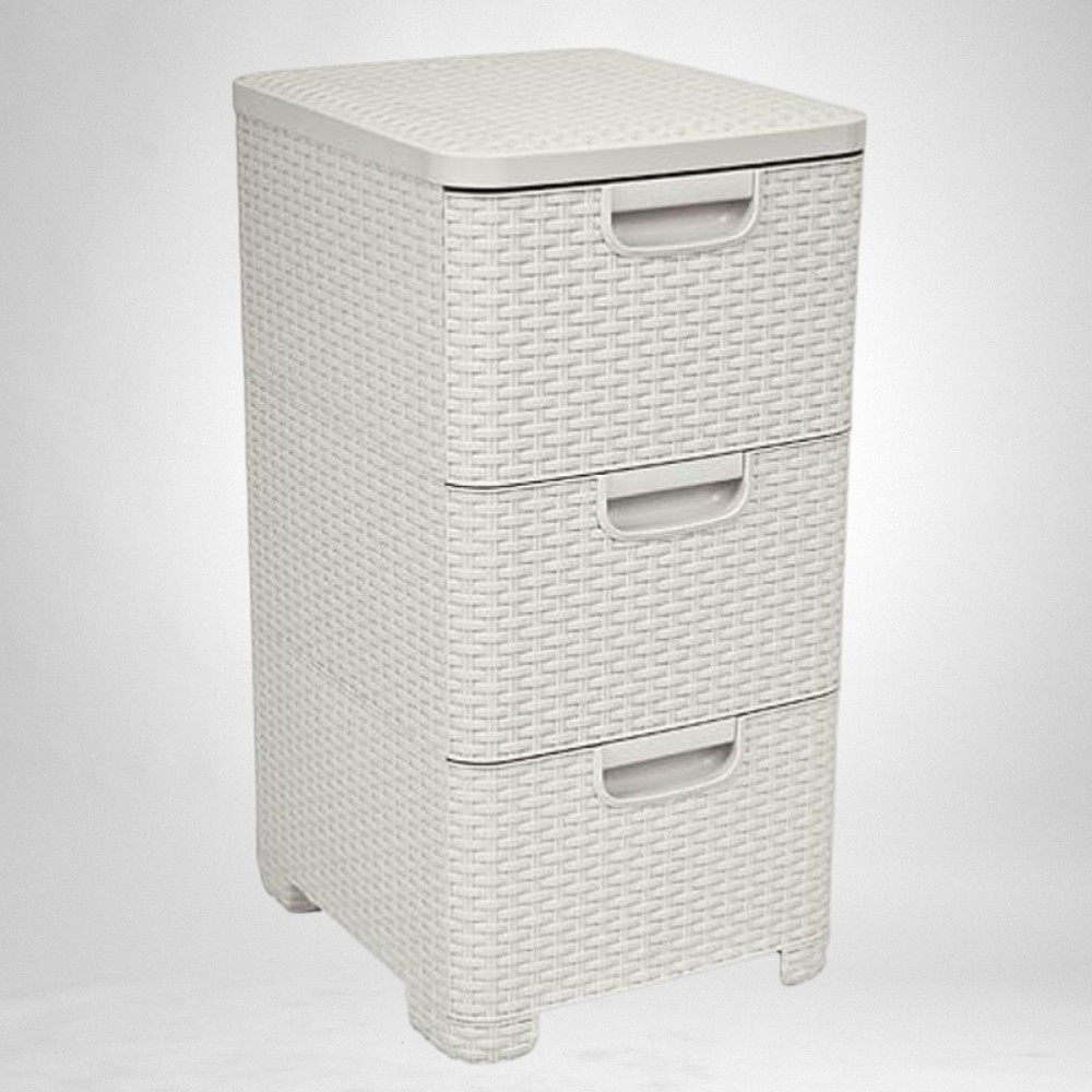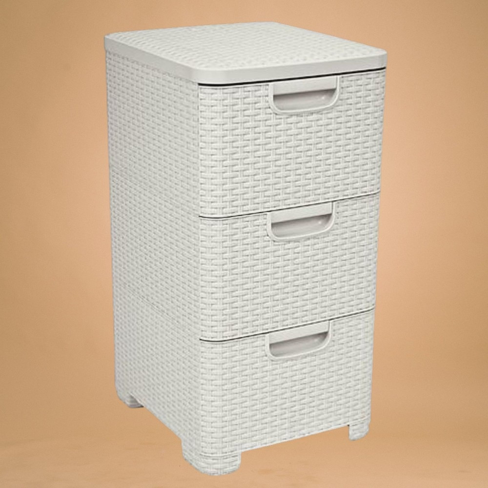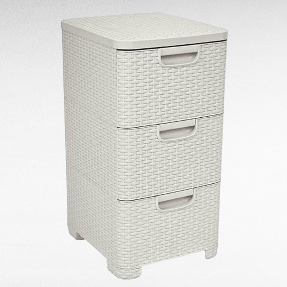 A Curver® STYLE 3 fiókos komód elegáns, rattan mintázatú krémszínű felületével természetes hangulatot csempész otthonodba. 33 cm-es szélességével, 60 cm-es magasságával és 38 cm-es mélységével ideális választás fürdőbe, hálóba vagy akár gardróbba. Tartós polipropilénből készült, így nedvesség- és rozsdamentes, miközben mindössze 3,51 kg-os súlyának köszönhetően könnyen mozgatható. Három tágas, egyenként 14 literes fiókja biztonságos és pormentes tárolást nyújt.
