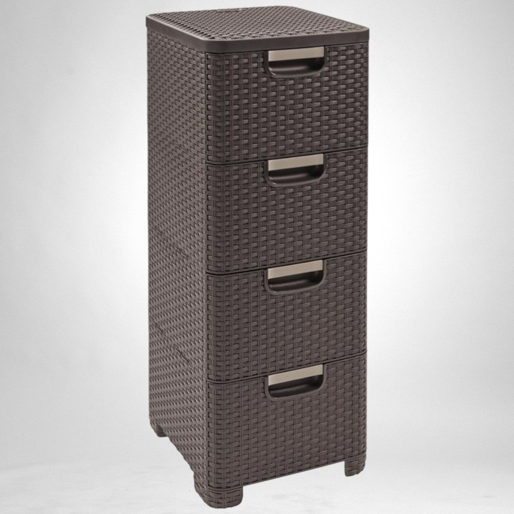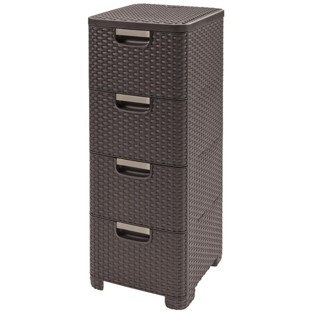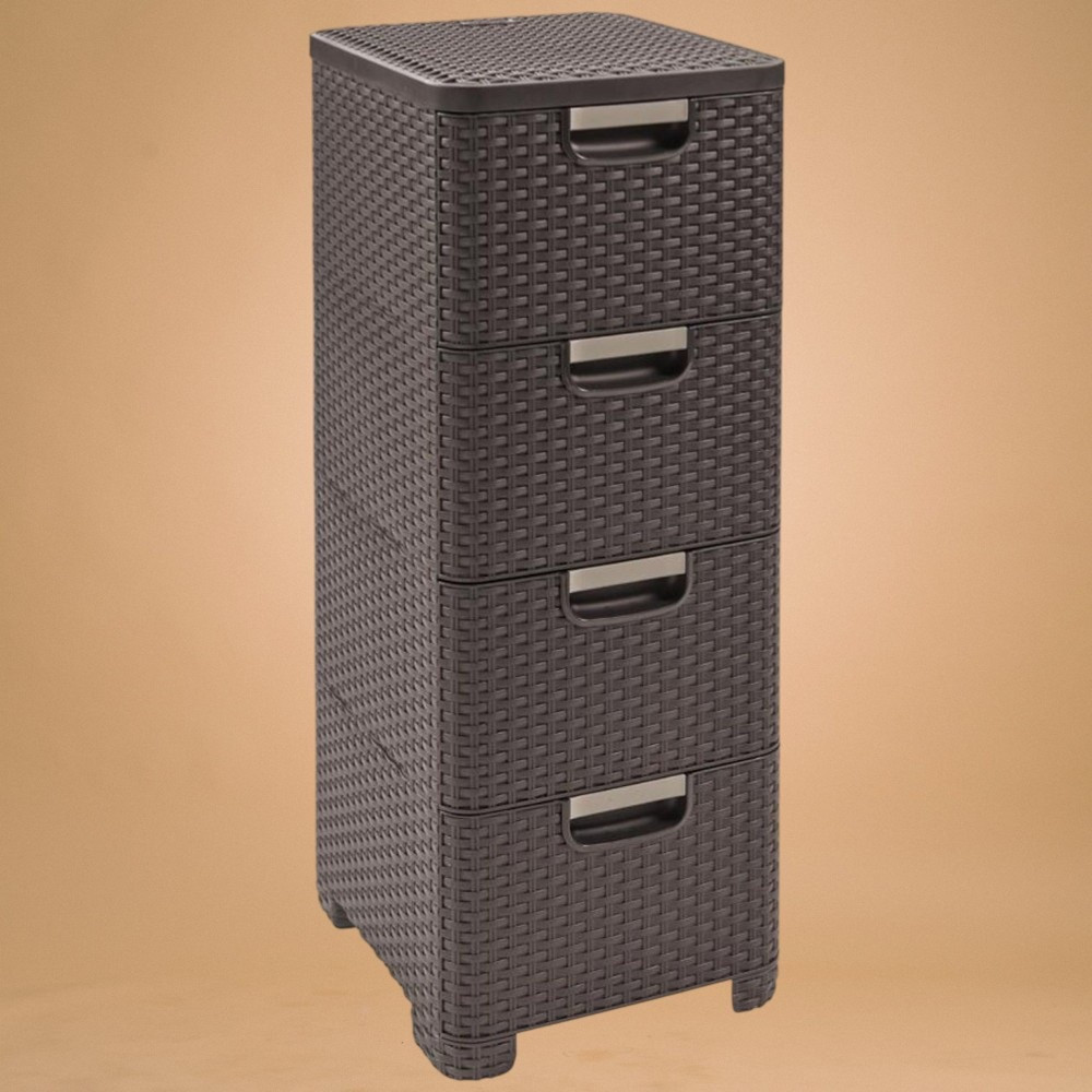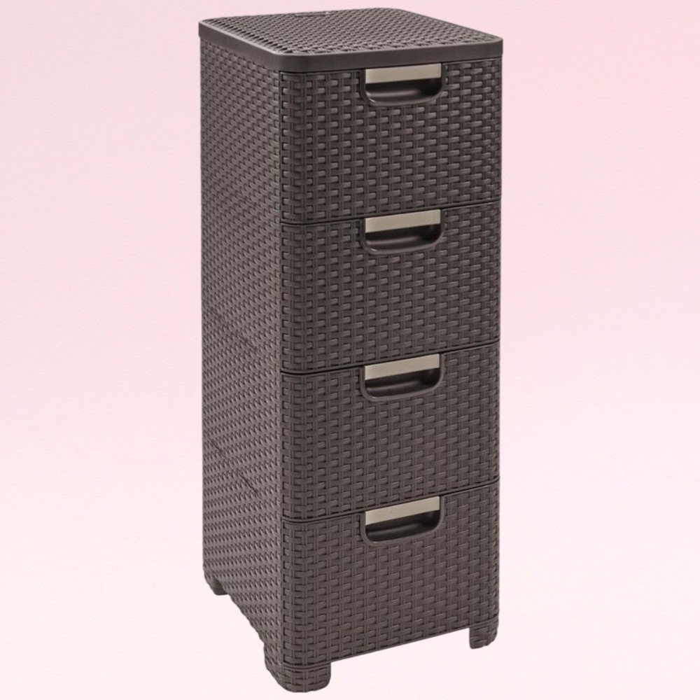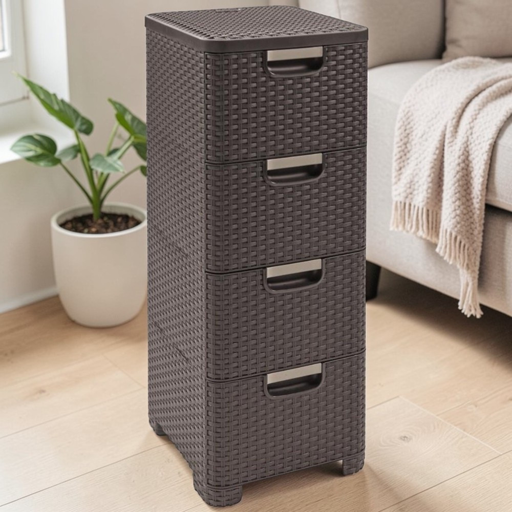 A Curver® STYLE négyfiókos komód elegáns, sötétbarna rattan-hatású felületével természetes melegséget visz otthonodba, miközben praktikus rendszerezőként szolgál. Karcsú, 33 × 79 × 38 cm-es méreténél fogva akár fürdőszobai sarokban, hálószobai gardróbban vagy a gyerekszoba sarkában is könnyedén elfér. A négy tágas, simán gördülő fiókban különböző méretű tárgyaidat – törölközőtől a játékig – portól és fröccsenő víztől védve tárolhatod. Tartós műanyag váza nedves helyiségekben is ellenálló, a lekerekített élek pedig biztonságos használatot garantálnak.
