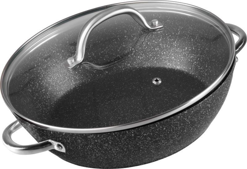 Hozd el a profi konyhák hangulatát otthonodba a MagicHome Black Marble Line lapos lábassal! A 26 cm átmérőjű, 2,8 literes edény tökéletes ragukhoz, pörköltekhez vagy akár egyben sült fogásokhoz. Alumíniumötvözet teste háromrétegű márvány bevonattal kapott extra tapadásmentes felületet, így minimális zsiradékkal is könnyedén dolgozhatsz. A 3 mm vastag indukciós talp gyorsan és egyenletesen oszlatja el a hőt, ezzel energiát spórolva. Rozsdamentes acél fogantyúi és a hőálló üvegfedő révén egyszerűen átteheted a lábast a főzőlapról a sütőbe.