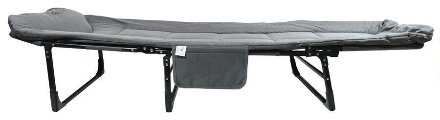 Lehátko zajišťuje stabilitu i komfort díky pevné konstrukci a měkké výplni. Zádovou část si přizpůsobíte podle potřeby, takže si užijete relax v jakékoliv poloze. Díky skládací konstrukci lehátko snadno přenesete nebo uskladníte. Navíc využijete praktickou kapsu na boku pro drobné předměty.