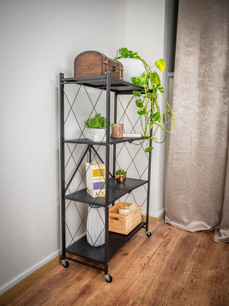 Ez a polcrendszer a rugalmasság és funkcionalitás tökéletes ötvözete. A 127 cm-es magasság és négy erős polc elegendő helyet kínál szerszámok, dobozok vagy háztartási kellékek számára. Az összecsukható funkció miatt ideális, ha időnként van csak szükséged plusz tárolóra. A modern fekete kivitel esztétikus és jól illeszkedik bármilyen környezetbe, a görgős kialakítás pedig mobilitást és kényelmes használatot biztosít.