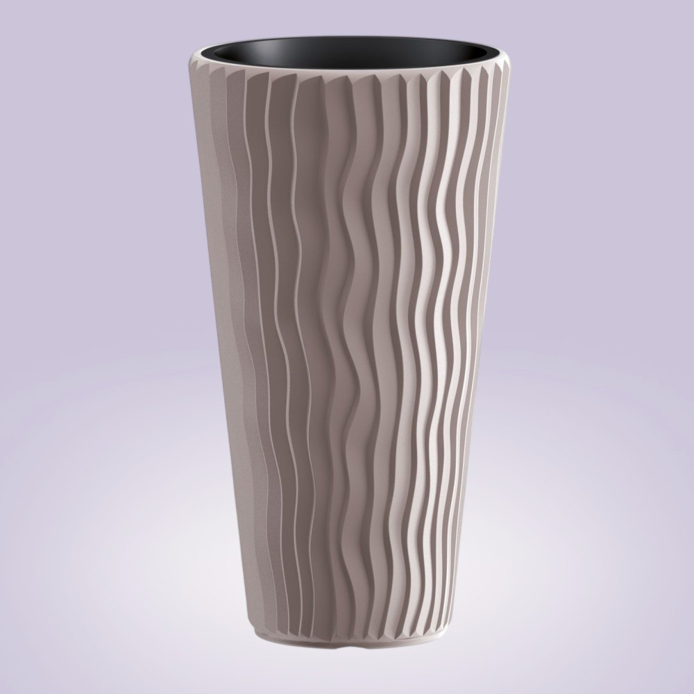 Az egyedi, hullámvonalas felület dinamizmust visz a környezetbe, mégis selymes tapintást nyújt, ami megkönnyíti a tisztítást. A mokka tónus harmonikusan kiemeli a lombozat friss zöldjét, beltéren és kültéren egyaránt. A betéttel kialakított rendszerrel kevesebb víz és tápanyag is elegendő, így gazdaságosabb a növénytartás, a gyökerek pedig optimális vízelvezetést kapnak.