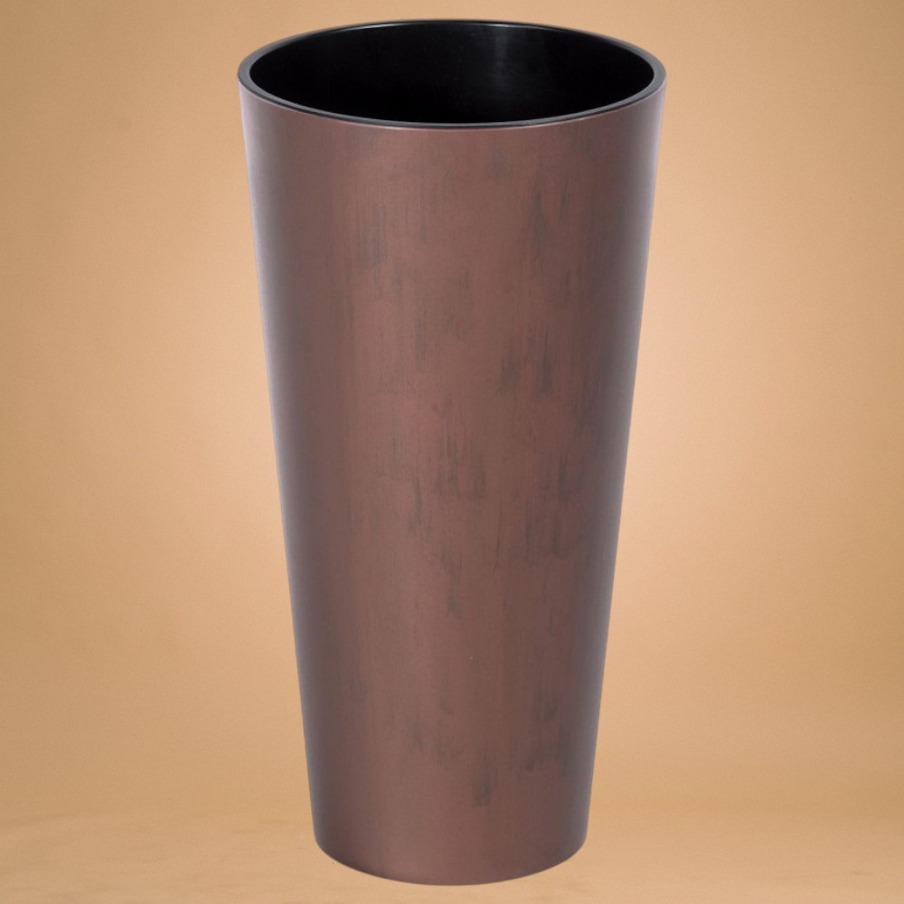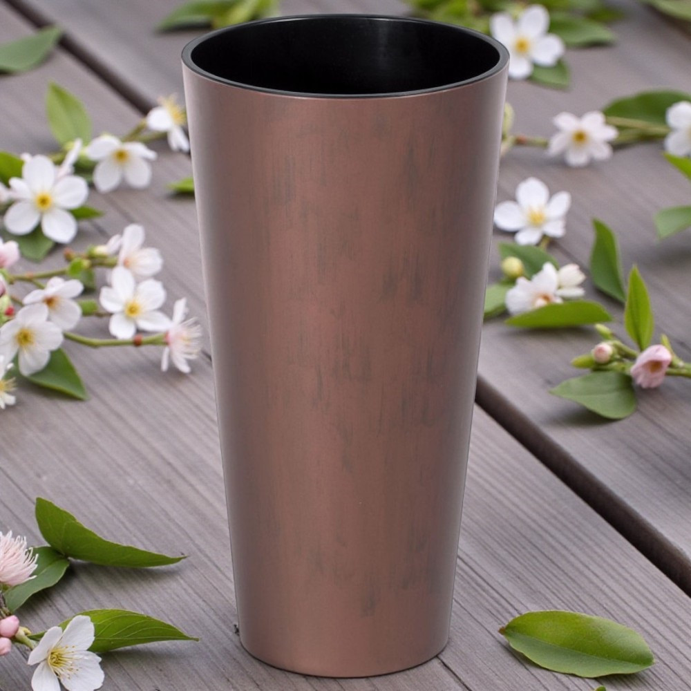 Modern, réz hatású külseje különleges loft hangulatot teremt anélkül, hogy a valódi fém gondozást igényelne. A betétnek köszönhetően kevesebb talaj is elég, így költséghatékonyabb az ültetés, ugyanakkor a növények gyökereinek elegendő hely jut a fejlődéshez. Könnyű súlya egyszerű mozgatást tesz lehetővé, mégis stabil marad, ha megtöltöd földdel. Időtálló műanyag szerkezete nem repedezik, ellenáll a tűző napnak, záporoknak és a téli fagyoknak, ezért egész évben nyugodtan kültéren hagyhatod.