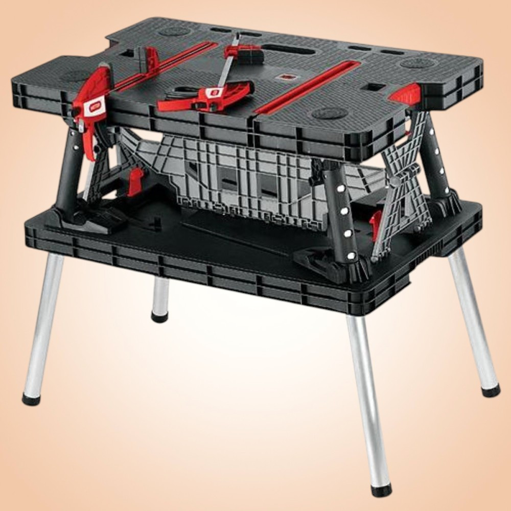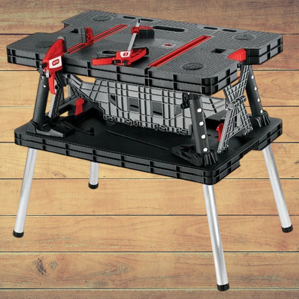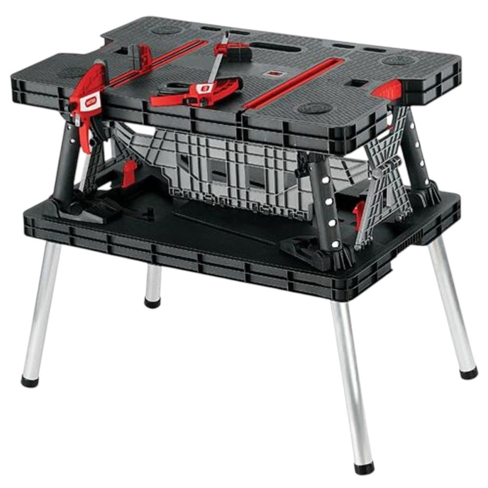Legyen mindig kéznél egy masszív, mégis mobilis munkafelület! A Keter® 17182239 összecsukható munkaasztal 85×55 cm-es lapjával bőséges teret ad a fűrészeléshez, fúráshoz vagy szereléshez, miközben mindössze pár mozdulattal felállítható. A polipropilén váz és az alumínium lábak 453 kg-os teherbírást garantálnak, így bátran ráhelyezheted a nehéz deszkákat, gépeket is. Összecsukva csupán 11,2 cm magas, ezért a csomagtartóban vagy műhelypolcon is könnyen elfér.