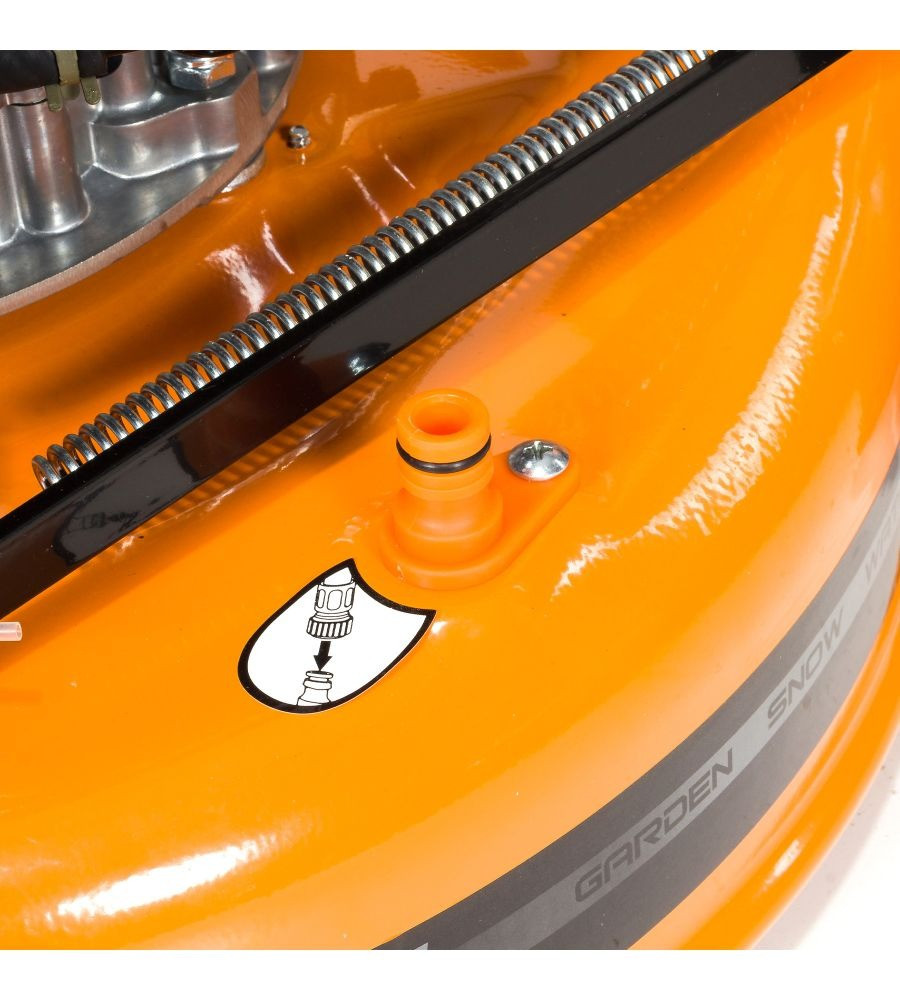Amikor befejezted a fűnyírást, a burkolat és a váz könnyen mosható. Egyszerűen csatlakoztasd a kerti tömlőt a fűnyíró burkolatán lévő gyorscsatlakozóhoz és indítsd el a fűnyírót.