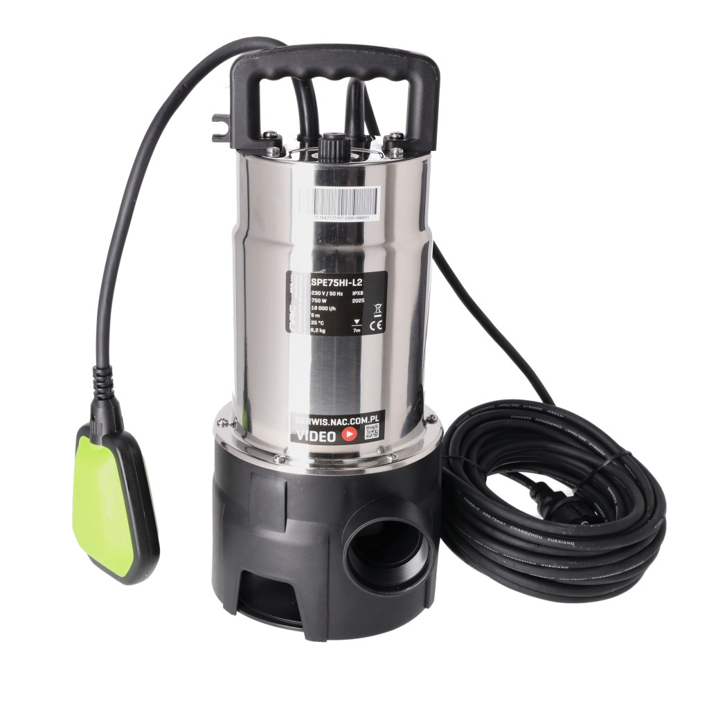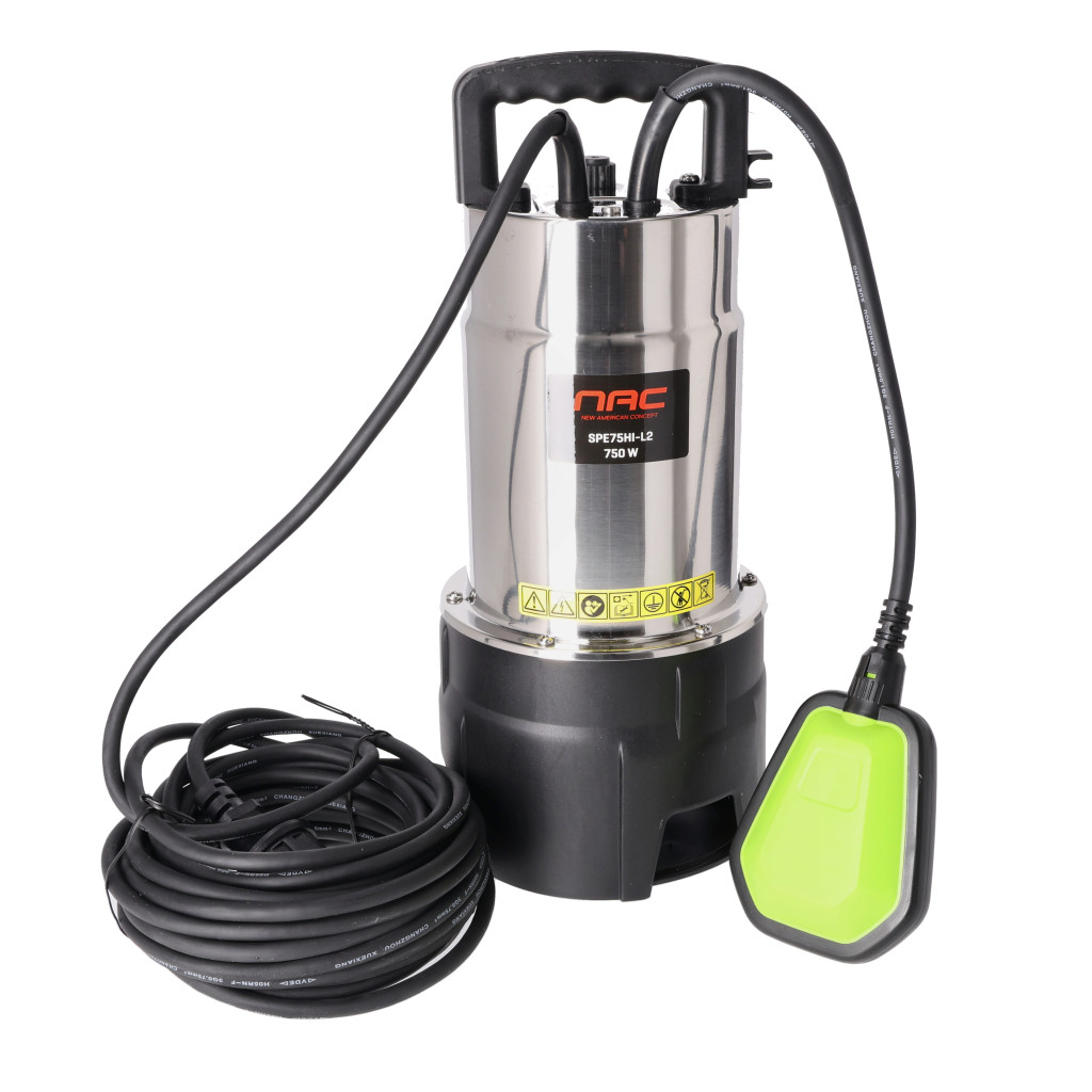 A NAC SPE75HI-L2 szivattyú rozsdamentes acél burkolattal van ellátva, amely védi a motort és a belső alkatrészeket. Akár 15 000 l/óra kapacitásával és 750 W teljesítményével gyorsan és könnyedén eltávolítja a vizet. A biztonságos működést a legfeljebb 35 mm-es szilárd részecskeméret, a 7 m merülési mélység és a 9 m emelőmagasság biztosítja. A 10 m hosszú kábelnek köszönhetően a szivattyút könnyen elhelyezheti nehezebben hozzáférhető helyeken is. Masszív kialakítása nehéz körülmények között is megállja a helyét, ahol más szivattyúk kudarcot vallanak.